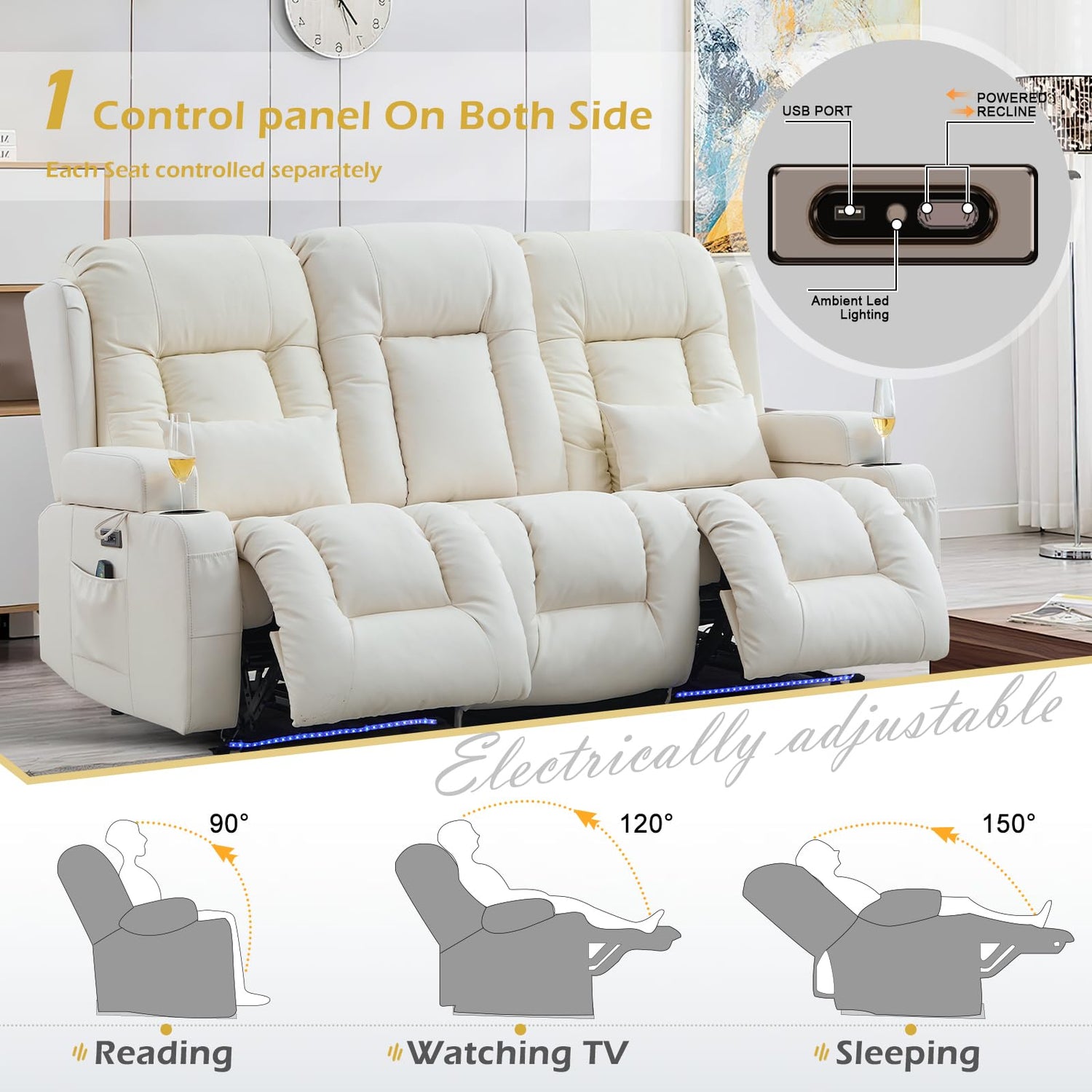 SENIFIS Loveseat Recliner Sofa, Leather Sofa with Massage & Heating, Home Theater Seating Power Reclining Loveseat with Outlet/LED Light/Cup Holders/Lumbar Pillows (Beige, 3 Seat)