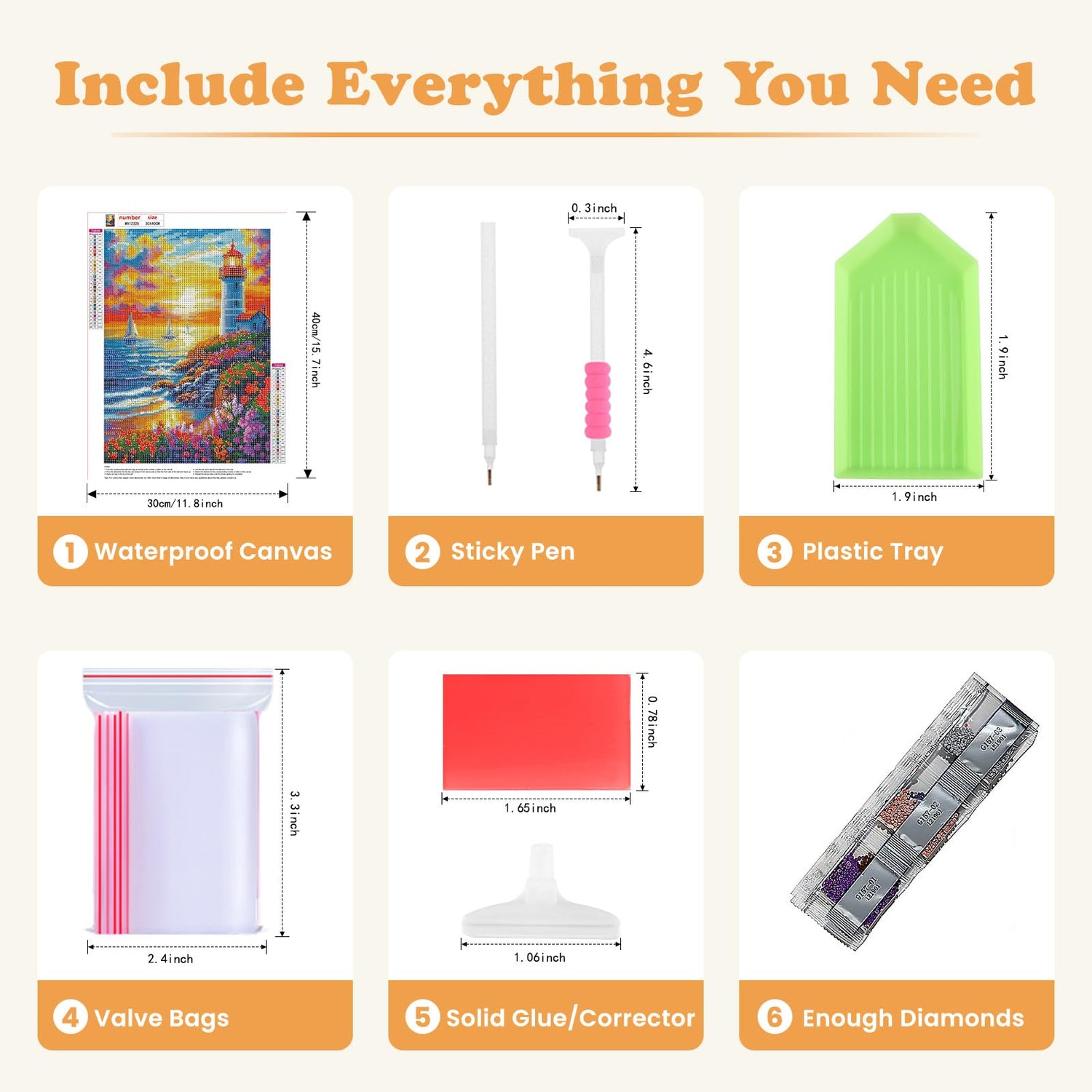SENQAO Lighthouse Diamond Art Kits for Adults, Sunset Diamond Painting Kits for Beginners,Seaside Landscape Diamonds Pictures Gem Art for Adults Crafts Home Decor 12x16inch(Lighthouse,Waves, Flowers)