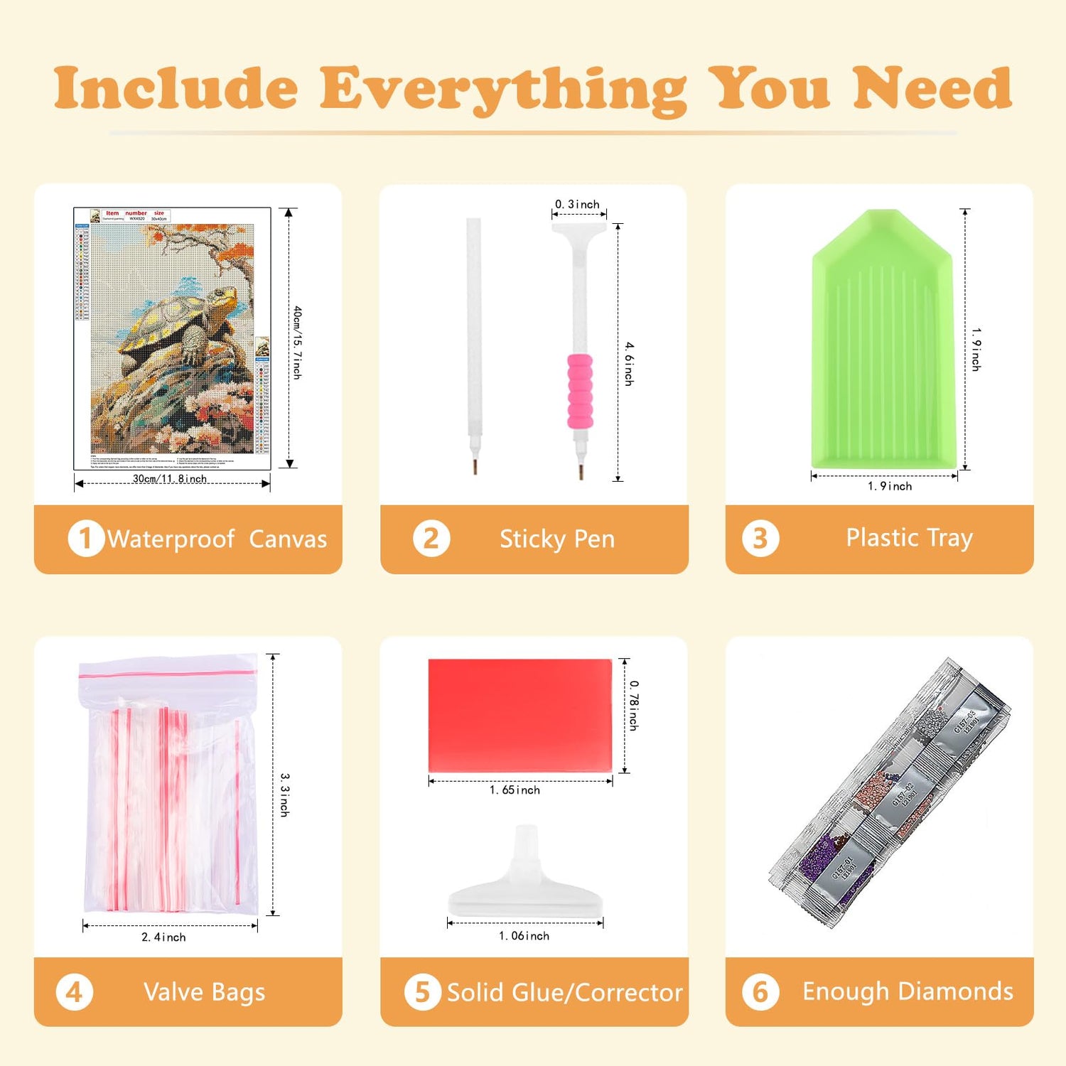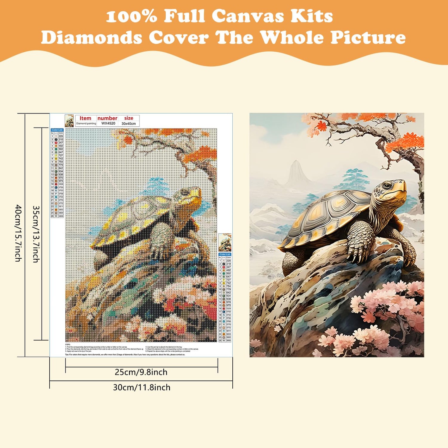 - Diamond Art Size And Package: 12 "x16" full Turtle diamond Diamond art,Include 1*high definition painting canvas, 2*point diamond pen, 1*cube diamond tray, 1*red glue clay, 1*pen cap, 5*valve bags.enough colorful round diamonds