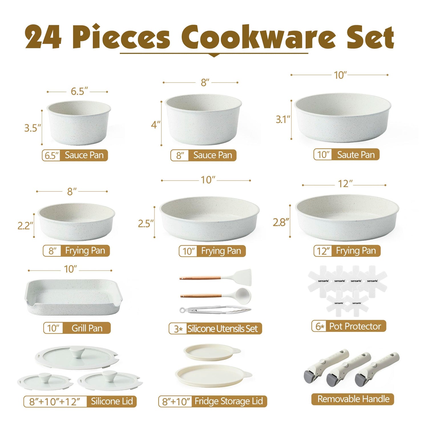 - 24-Piece Cookware Set Includes - 1.5QT Sauce Pan, 2.8QT Sauce Pan, 8 inch Frying Pan, 10 inch Frying Pan, 10 inch(4QT) Saute Pan, 10 inch Grill Pan, 12 inch Frying Pan, Removable Handle*3, 8 inch Glass Lid, 10 inch Glass Lid, 12 inch Glass Lid, Pot Protector*6, Fridge Storage Lid*2, Silicone Utensils Set*3
