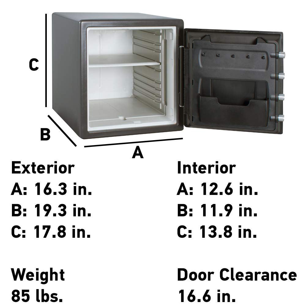 - MEASUREMENTS: Exterior is 16.3 W x 19.3 D x 17.8 inches H and Interior: 12.6 W x 11.9 D x 13.8 inches H, Large 1.23 cubic foot capacity safe weighs 85 pounds