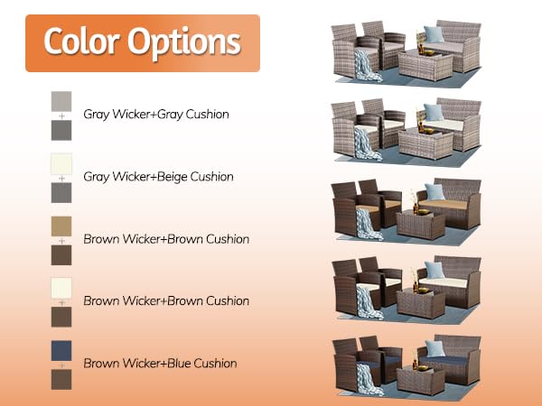 - All-Weather Wicker:Crafted with high-quality PE wicker, our furniture set is built to withstand various weather conditions, allowing for year-round use. The durable material ensures that the set maintains its appeal and functionality.Note: cushions are not water-proof, When you don' t use it, advise you to take cushions inside for longer service time