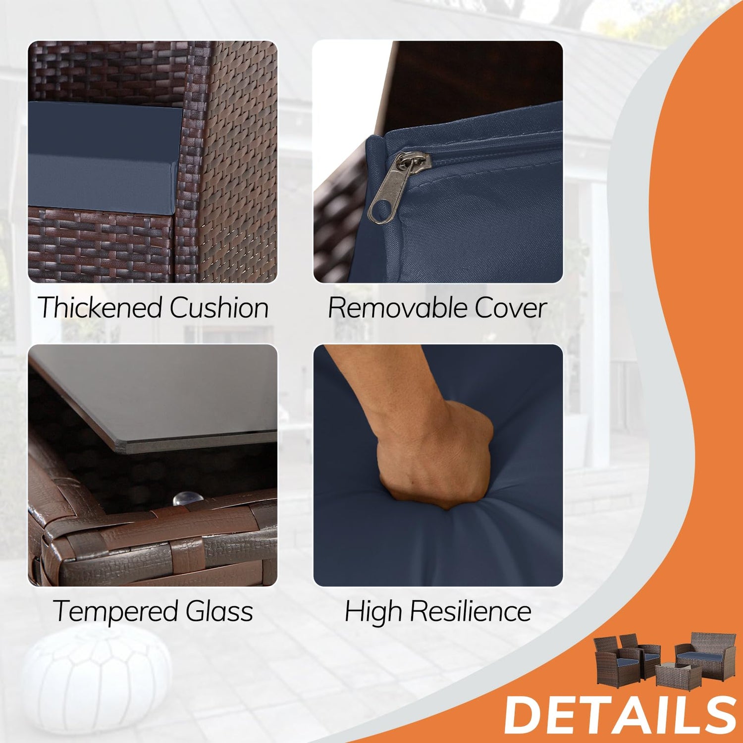 - Easy To Clean:The patio furniture set features a table made of high-quality tempered glass that can be used to place beverages, food, and beautiful decorations. The cushion cover has a zipper which makes it easy to remove the cover and the splash-proof material is easy to clean