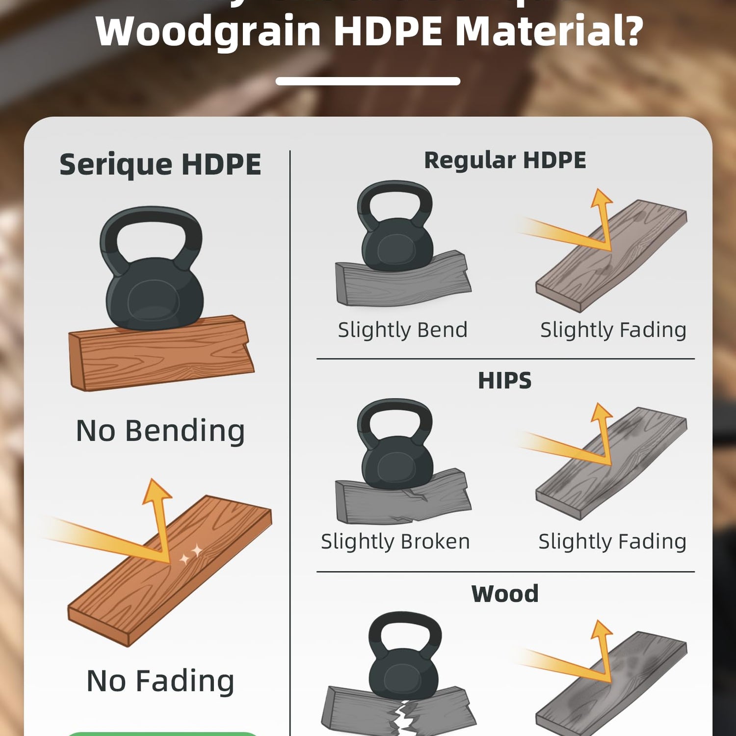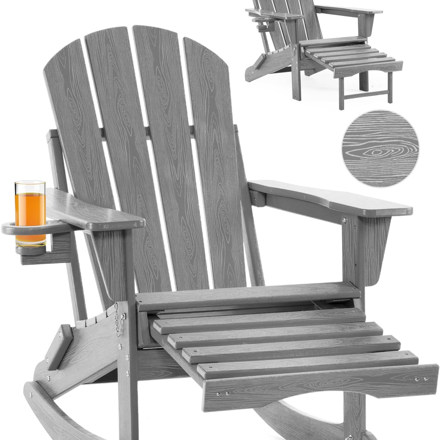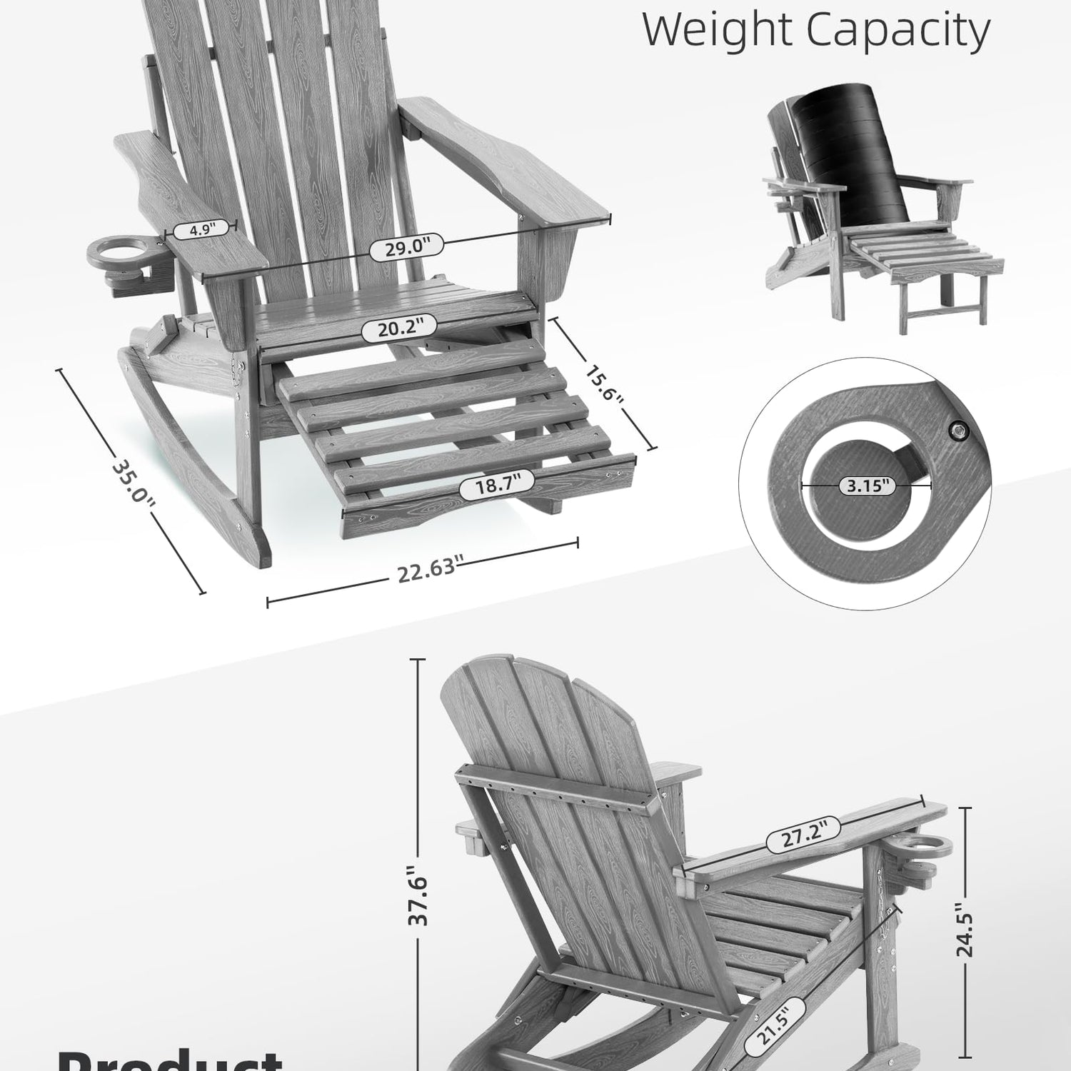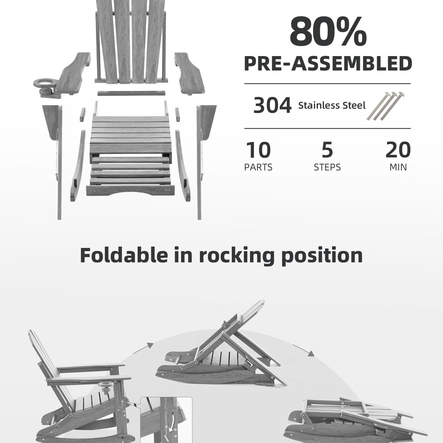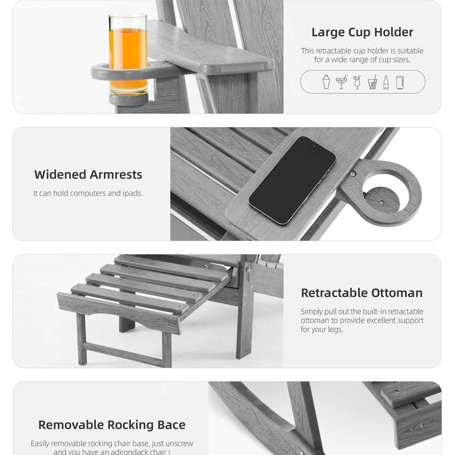 Serique 4-in-1 Multifunctional Folding Adirondack Rocking Chair, Patio Chair with Retractable Ottoman, Outdoor Chair Wood Texture, Lawn Chair for Porch, Backyard, Pool(Grey)