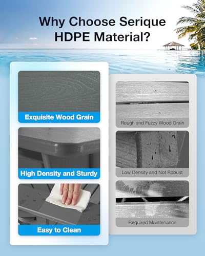 - 【Why choose Serique?】Serique adirondack chair is made of a new wood grain HDPE sheet - "SERIQUE-WOOD", which is exclusively formulated to be heavier than the ordinary wood grain HDPE sheet, with a net weight of 38LBS, and is able to withstand at least 380LBS of weight. Serique has been producing HDPE chairs since 2006, supplying to offline supermarkets. Serique has improved the defects of ordinary wood grain HDPE sheet, the Serique sheet is denser and stronger, the wood grain is more exquisite.