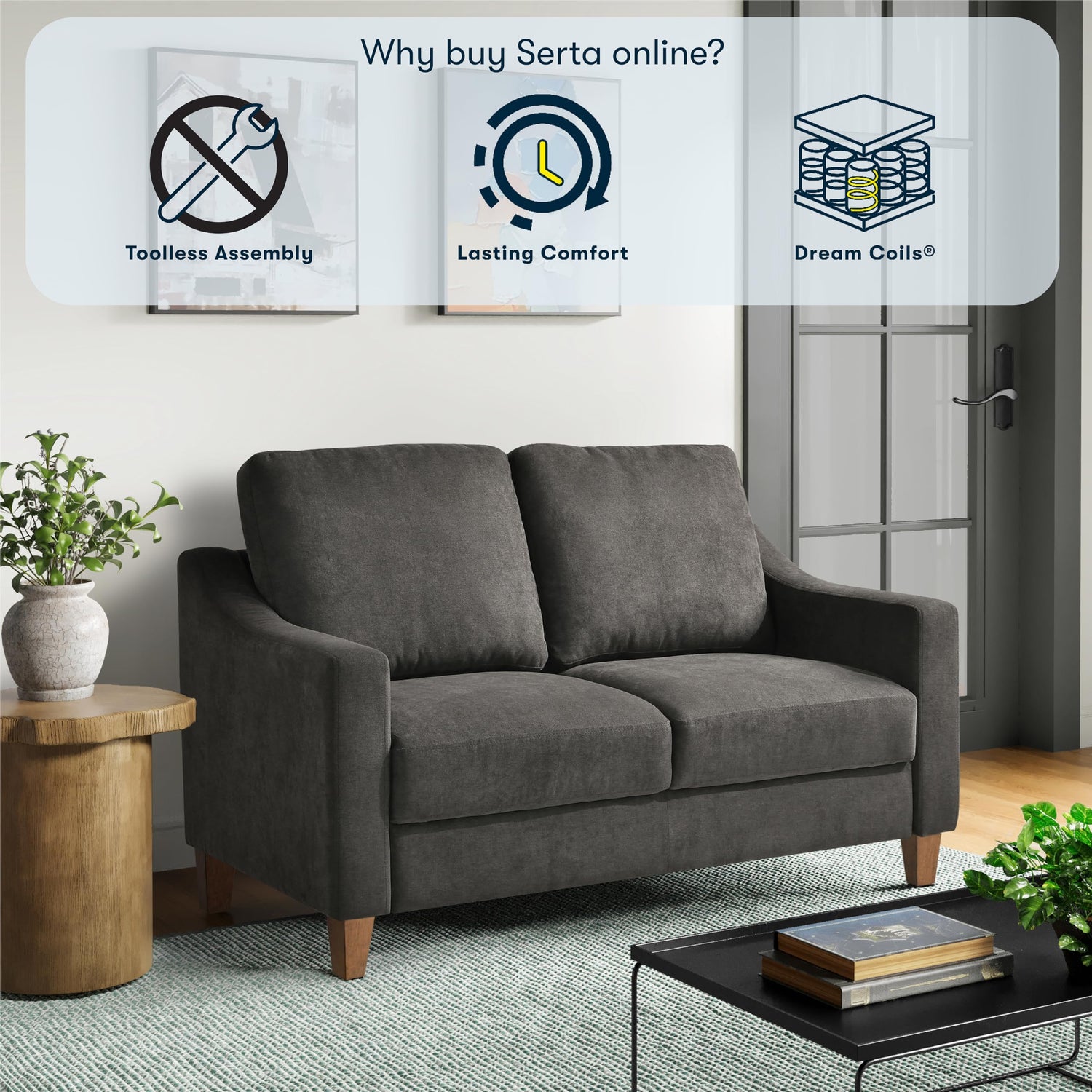 Serta® Armstrong 52" Soft Modern Sofa, Sloped Track Arms, Solid Wood Legs, Easy Assembly, Dream Coil® Comfort, Soft Woven Polyester Fabric, Gray
