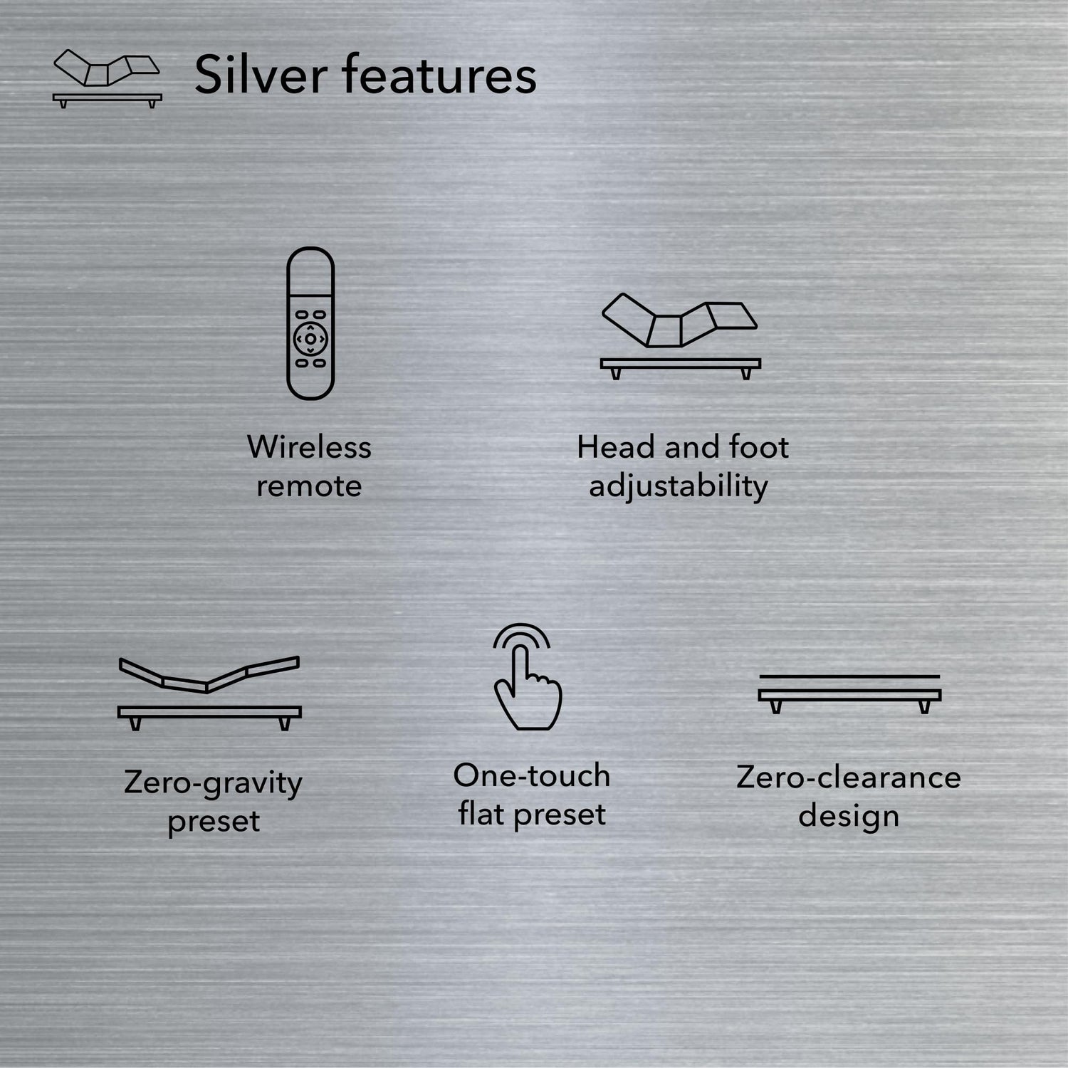Details: Upgrade your comfort with the baselogic Silver Adjustable Base, designed to enhance both your sleep and lounging experience with added adjustability and convenience. Enjoy personalized comfort with head and foot adjustability, allowing you to raise or lower your upper body and legs to find your ideal position. The built-in Zero-Gravity preset helps relieve pressure points, promoting deeper relaxation and better rest. A wireless remote gives you the freedom to adjust your settings with ease, while the one-touch flat preset instantly returns the base to a flat position. For added flexibility, the Silver Base features a foldable design for easy storage and transport, a zero-clearance profile for compatibility with most bed frames and platforms, and 3-in-1 adjustable legs offering three height options up to 12 inches. Thoughtfully designed with both comfort and convenience in mind, the baselogic Silver Base helps you rest, relax, and recharge—your way.