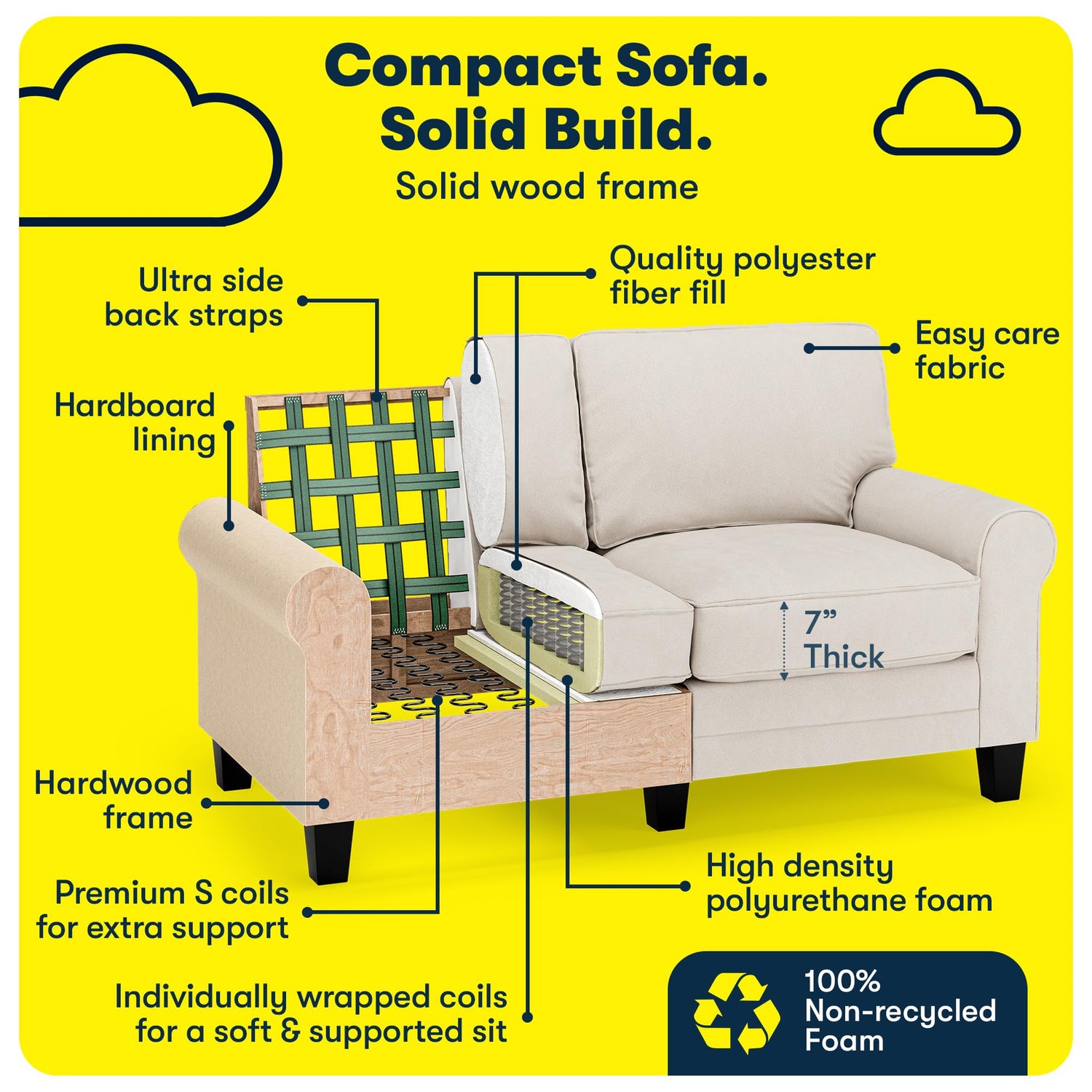 Serta Copenhagen 61" Rolled Arm Sofa, Easy Care Polyester, Soft Pillow Back, Pocket Coil Seat Cushions, Removable Covers, Loveseat or Couch for Small Spaces, Living Rooms or Bedrooms, Cream White