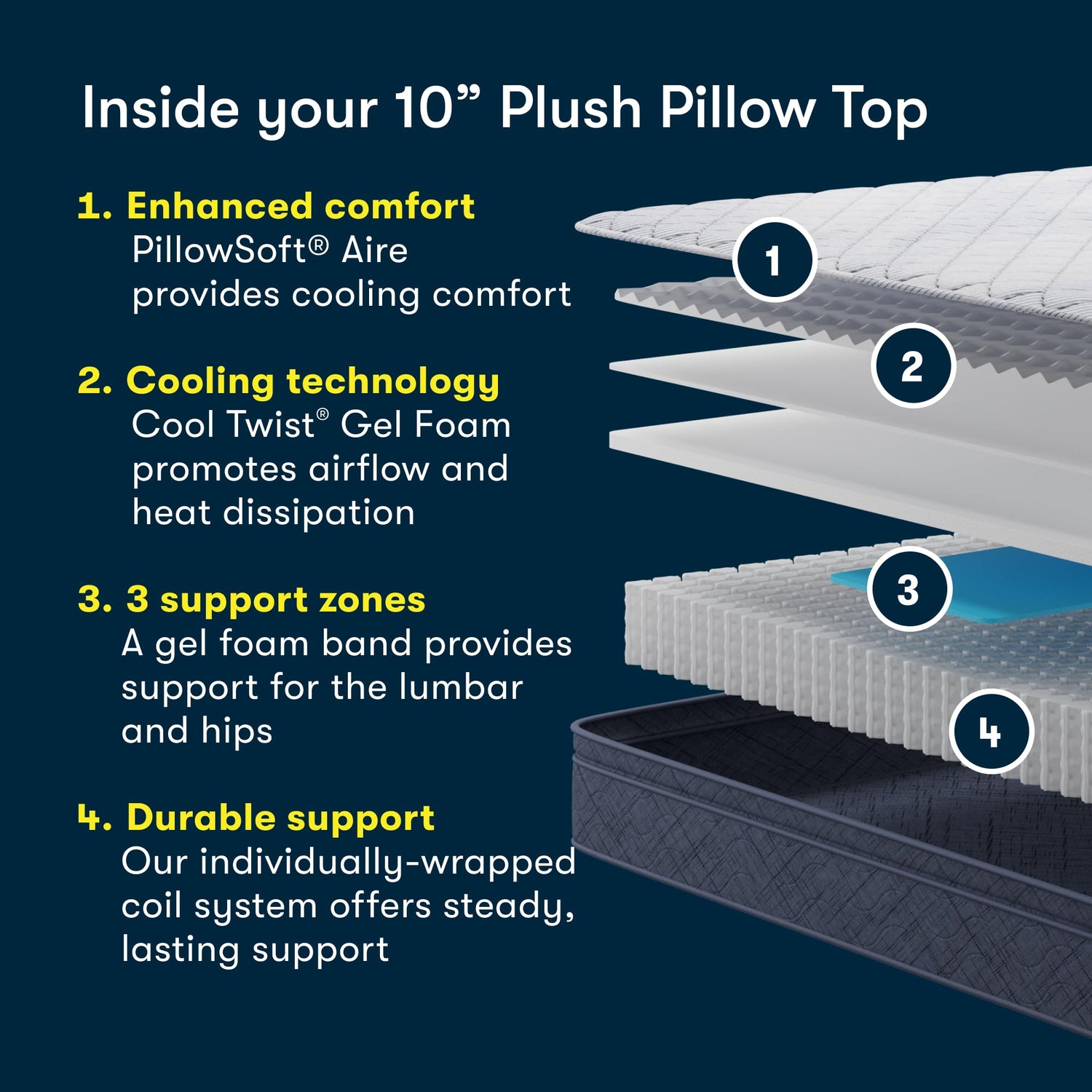 Details: Enjoy breathable, cushioned comfort with the Serta Five Star Mattress Tranquility 10” Plush Pillow Top Mattress. Plush foam layers offer instant softness, while a gel-infused lumbar band provides targeted support for hips and lower back. Enjoy peace of mind knowing all foams are CertiPUR-US . Cooling materials move heat away from the body while the supportive coil system limits disturbances for uninterrupted rest. Great for any bedroom, this mattress-in-a-box delivers premium comfort at an unbeatable value. 100 Night Trial, 10-Year Limited Warranty