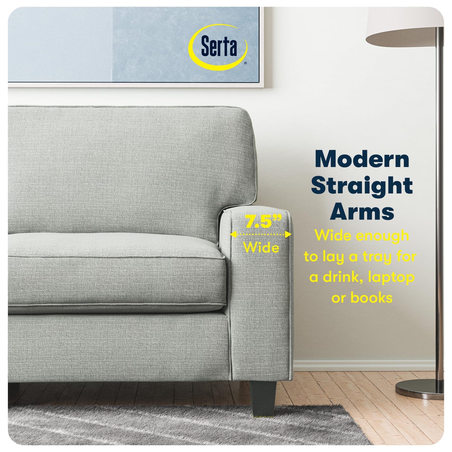 - SERTA FOAM & BUILD: Made of a solid wood frame fitted with sinuous springs for extra support and sturdy solid wood legs that can handle up to 600 lbs. All Serta sofas use quality, non-recycled and non-toxic foam for breathability and safety.