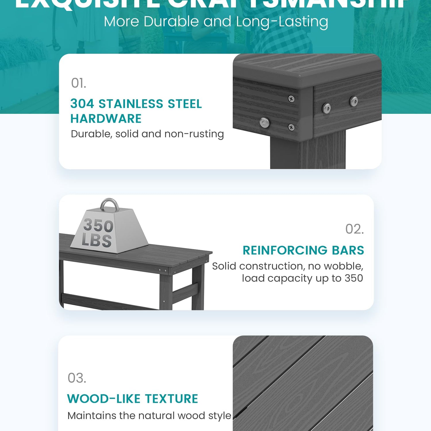 - Maintenance-Free: The outdoor counter height table is engineered for effortless upkeep. It's waterproof and fade-resistant, eliminating the need for painting, staining, or waterproofing. Cleaning is simple—just use soap, water, and a soft bristle brush or sanding sponge.
