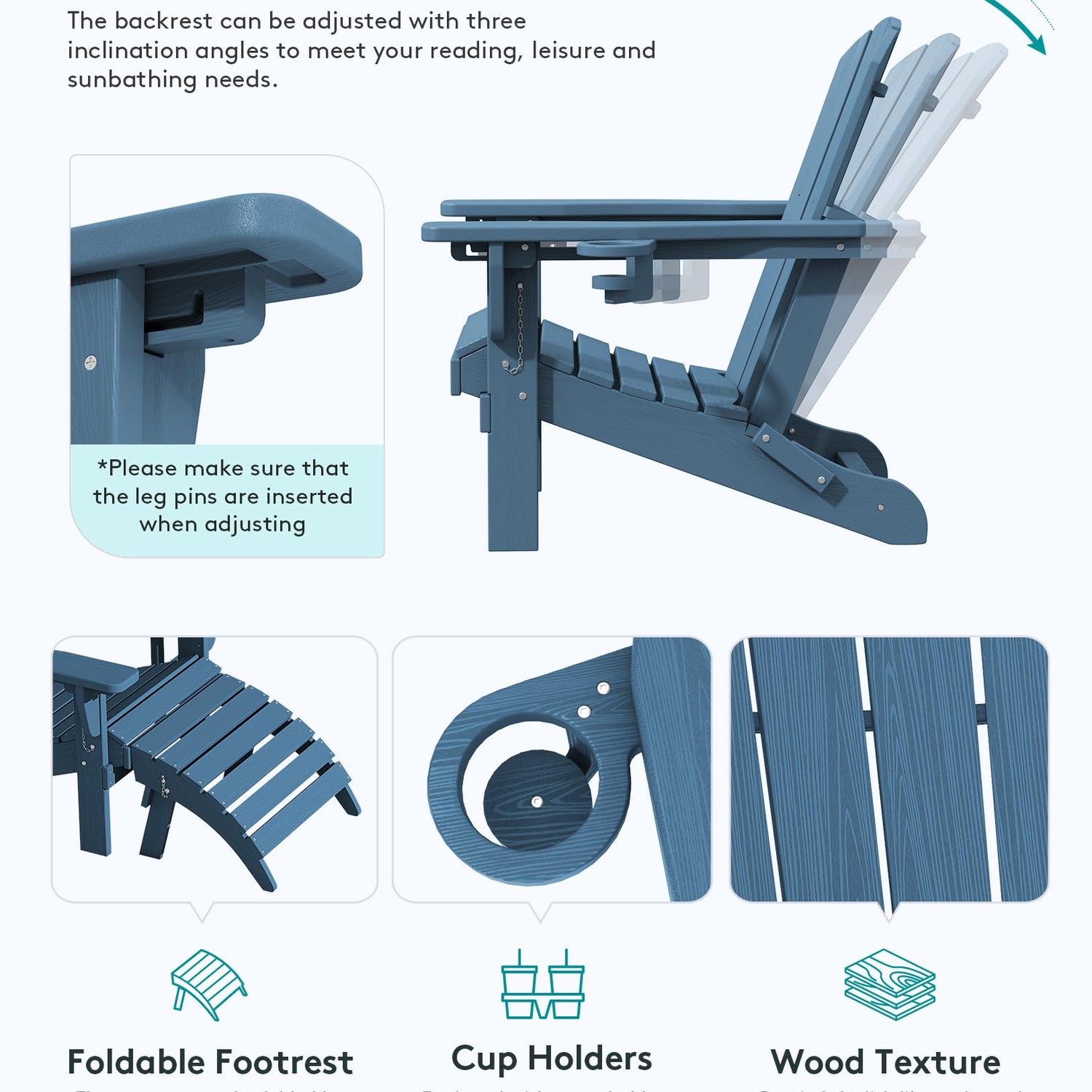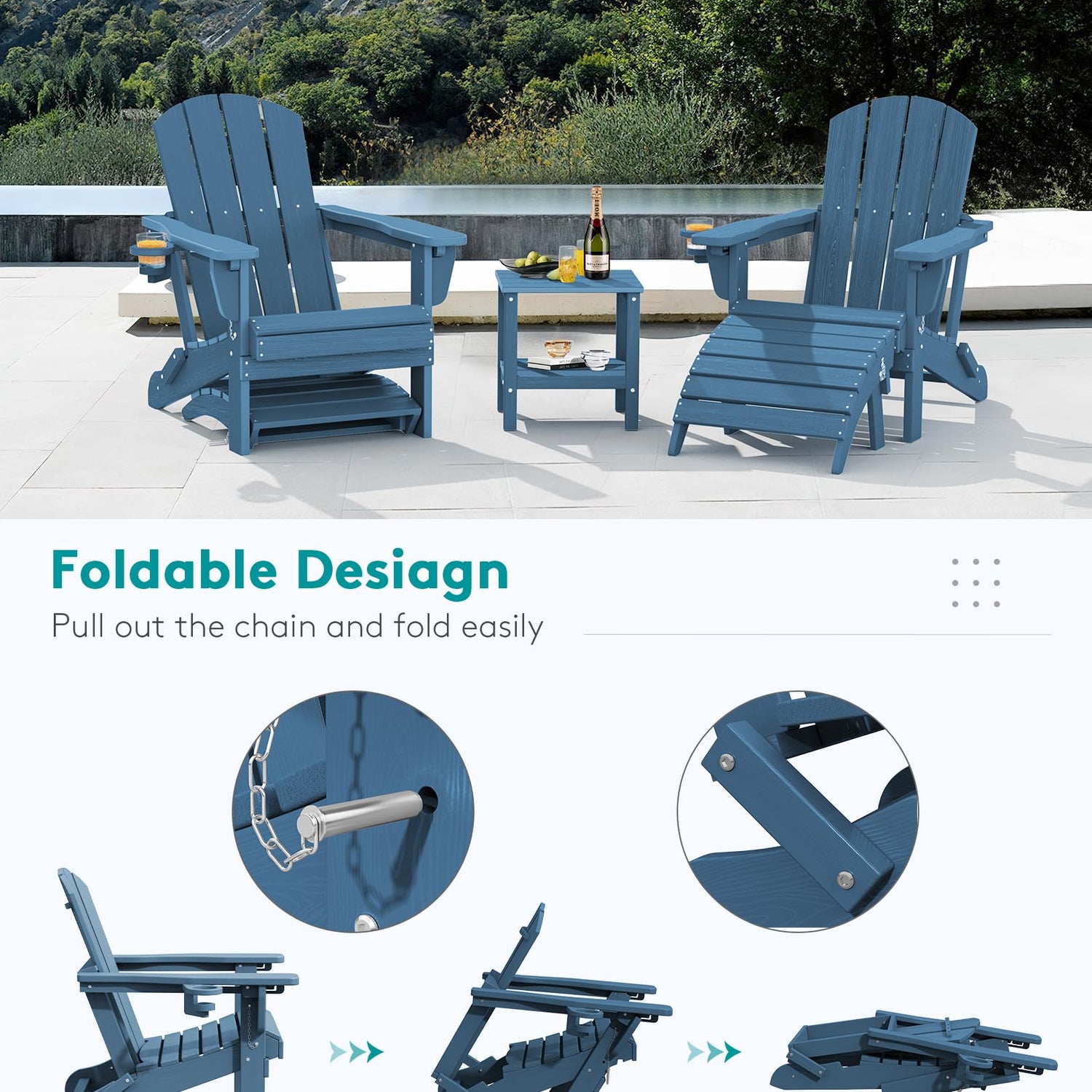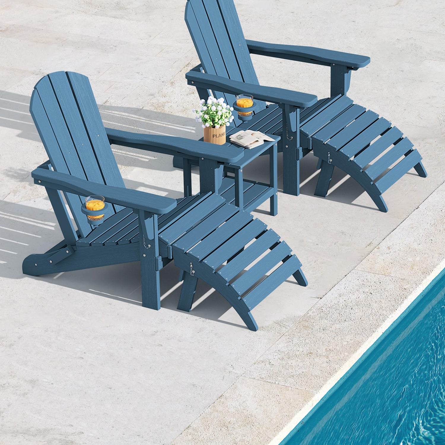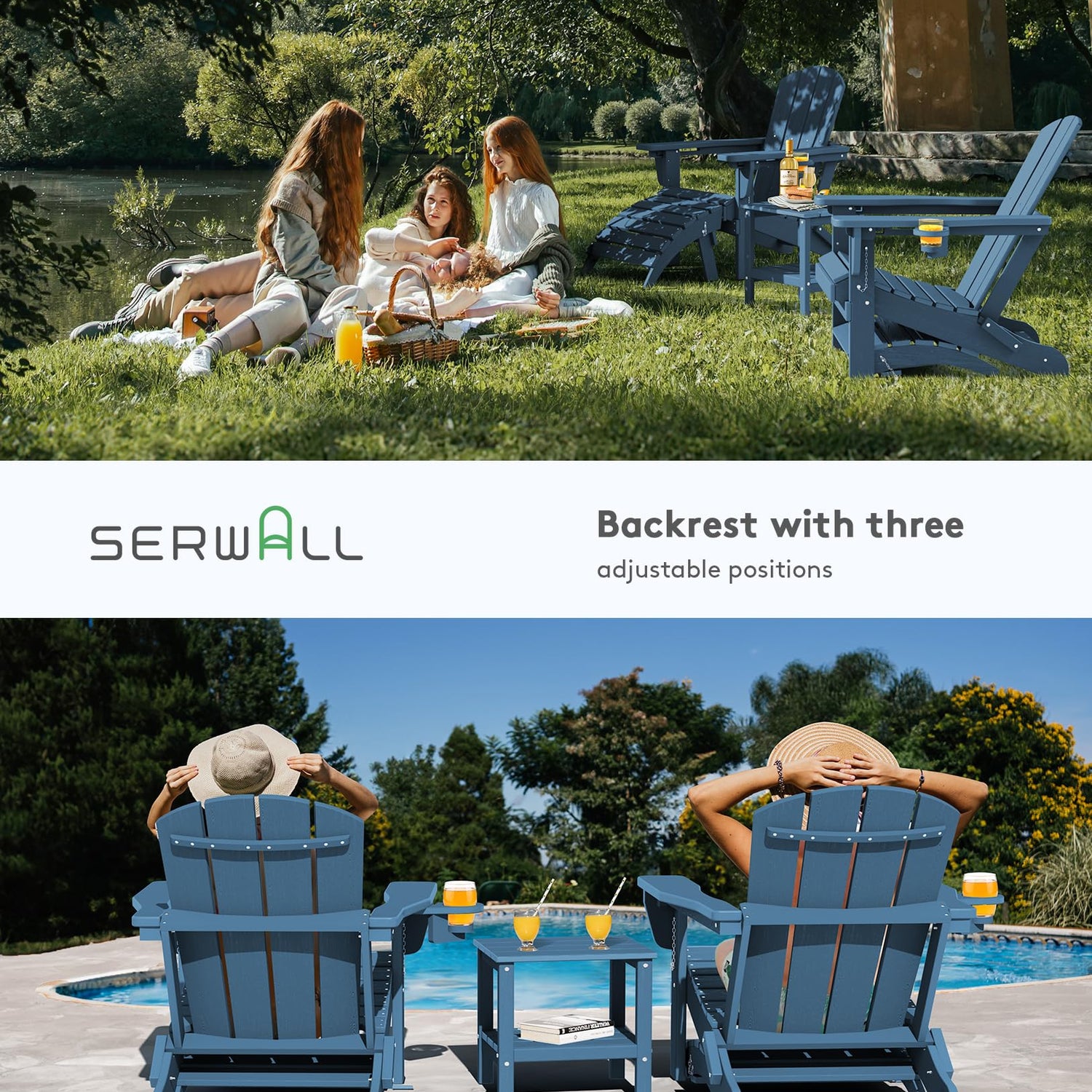 SERWALL 5-Piece Adirondack Chair and Ottoman and Table Set, HDPE Weather Resistant Adjustable Backrest Adirondack Chair with Ottoman and Side Table, Navy