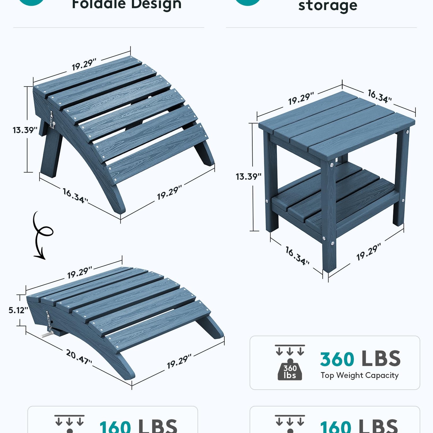 - Complete Adirondack Set: Package includes: 2 Adjustable Adirondack Chairs, 2 Folding Adirondack Ottoman, A Double Layer Outdoor Side Table. Everything you need for a cozy outdoor seating arrangement is included, making it convenient for setting up your relaxation zone.