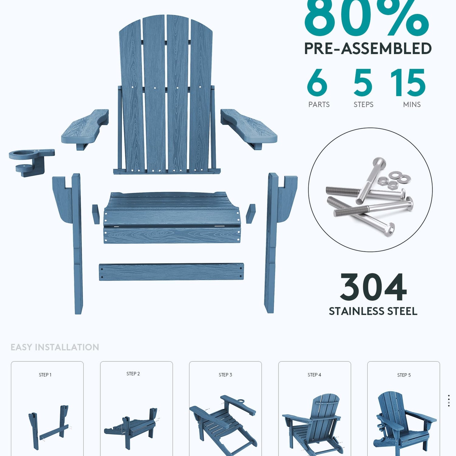 - Matching Instant Use Folding Adirondack Ottoman: Accompanying ottomans perfectly designed to complement the Adirondack chairs, allowing you to kick back and elevate your legs for complete relaxation. Effortlessly folds without the need for tools, making it easy store under SERWALL Adirondack Chair.