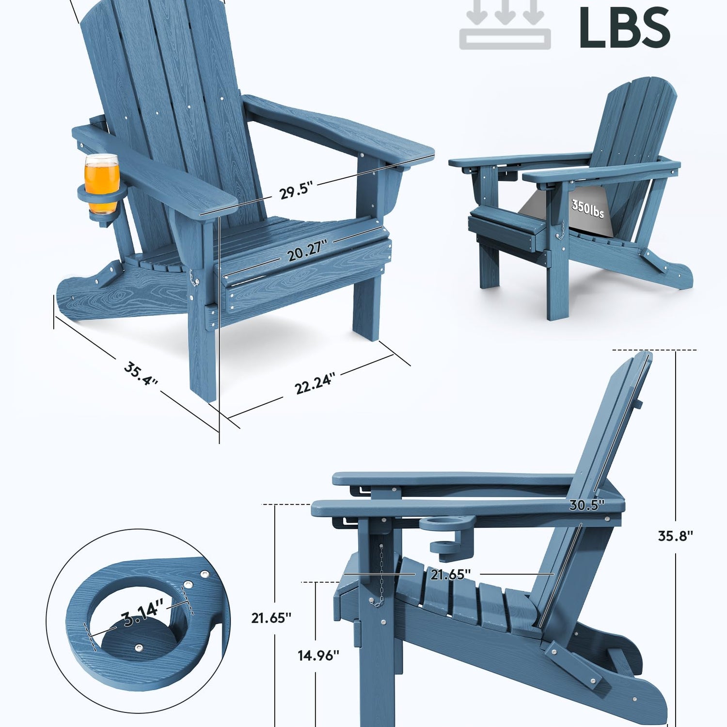 - Graceful and Elegant Design: SERWALL Folding Adirondack Chair overall dimensions: 35.4 " D X 29.5"W X 35.8"H. Because of the W20.3" x D17.3" seat and 1"-1.5" thick panels, the adjustable adirondack chair can easily support up to 380 pounds. And at the same time, the 3.14-inch diameter cup holder accommodates any cup size.