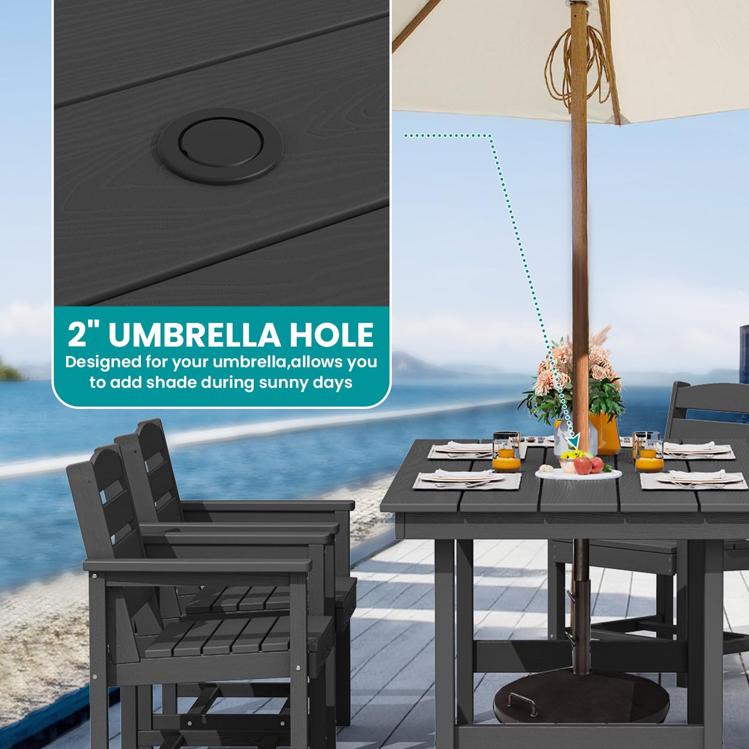 SERWALL 7-Piece Patio Dining Table Sets, Outdoor HDPE Dining Furniture Set with Umbrella Hole Cut-Out Table and 6 Chairs, Black