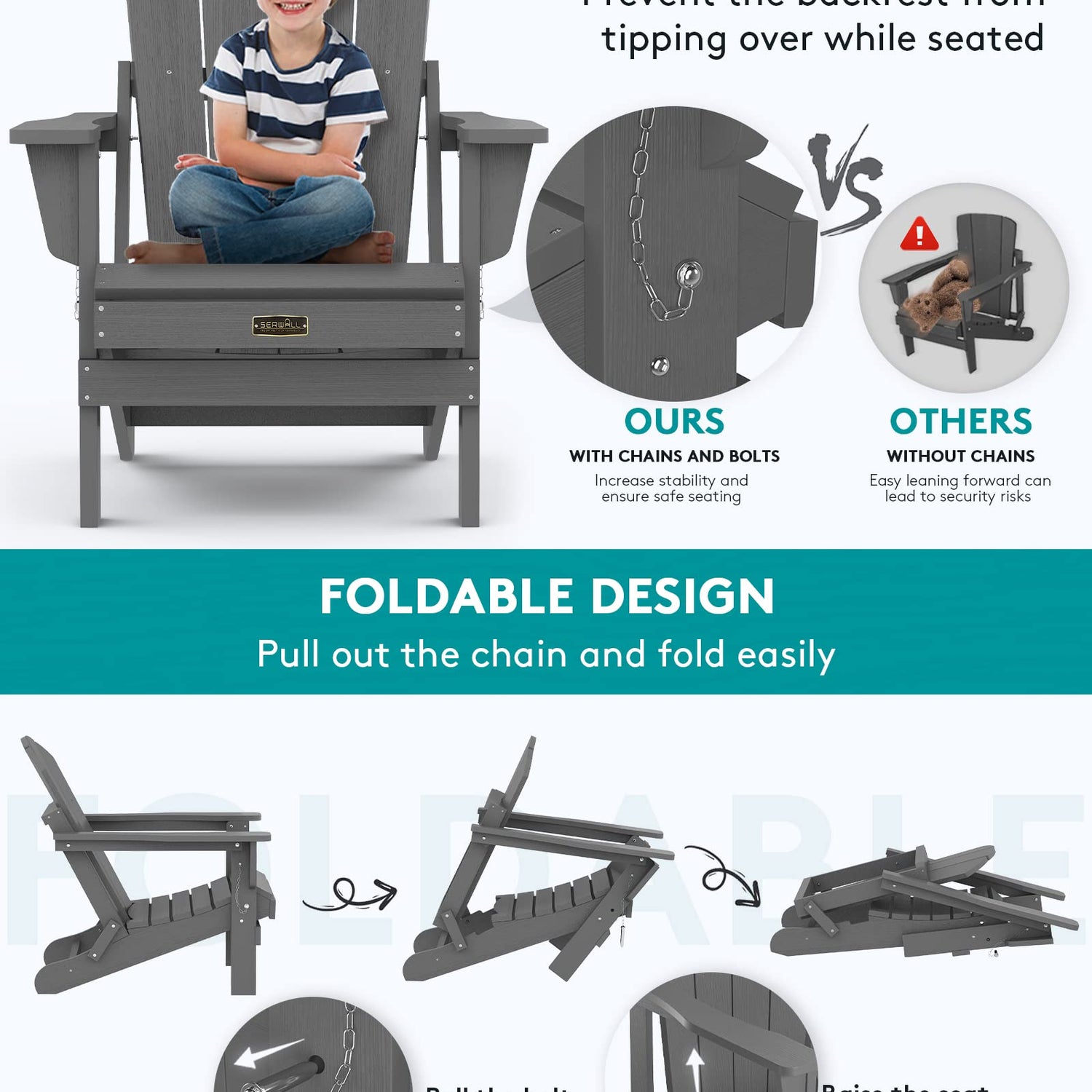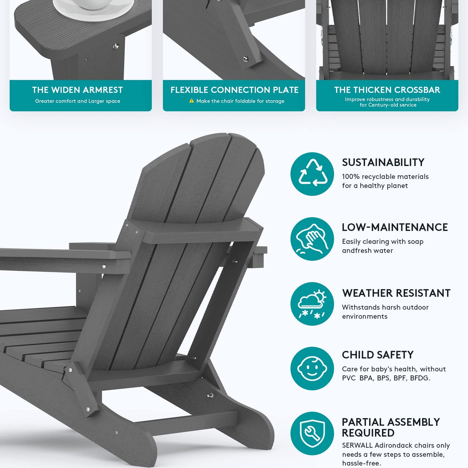 - WEATHER RESISTANT AND FADE-PROOF: Made of high-quality HIPS material, SERWALL Adiorndack Chair incorporates advanced color retention technology that ensures the chair's durability and resistance to fading, splitting, cracking, chipping, peeling or rotting when exposed to harsh weather conditions.