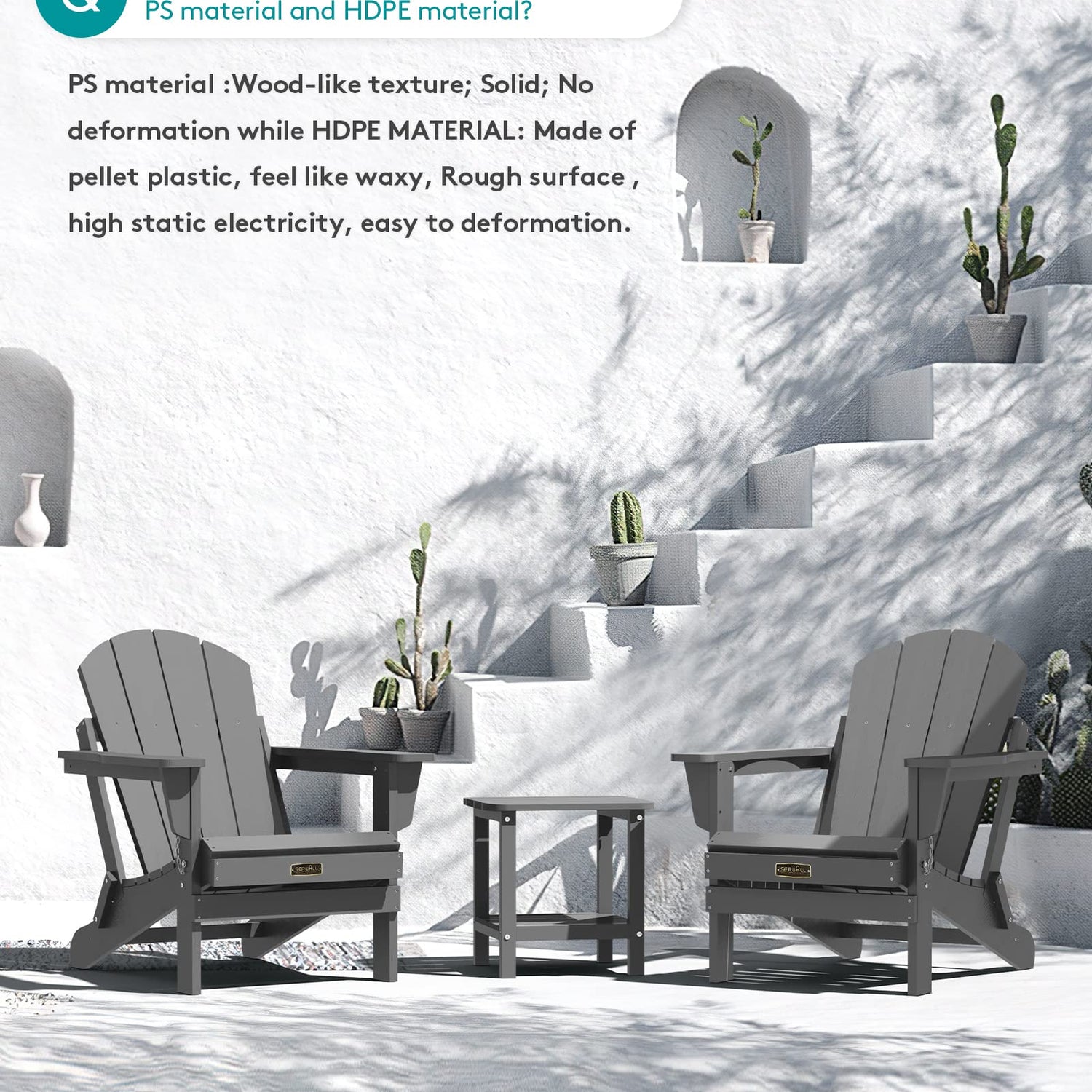 - STRENGTH AND DURABILITY: The HIPS material- Toughness is about four times higher than ordinary PS, with better impact strength. The melting temperature of PS is 150 ~ 180°C. SERWALL composite Adirondack chair is subject to a variety of climate changes including strong wind, sun exposure.