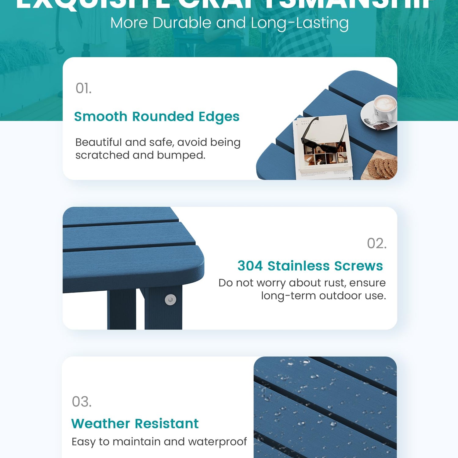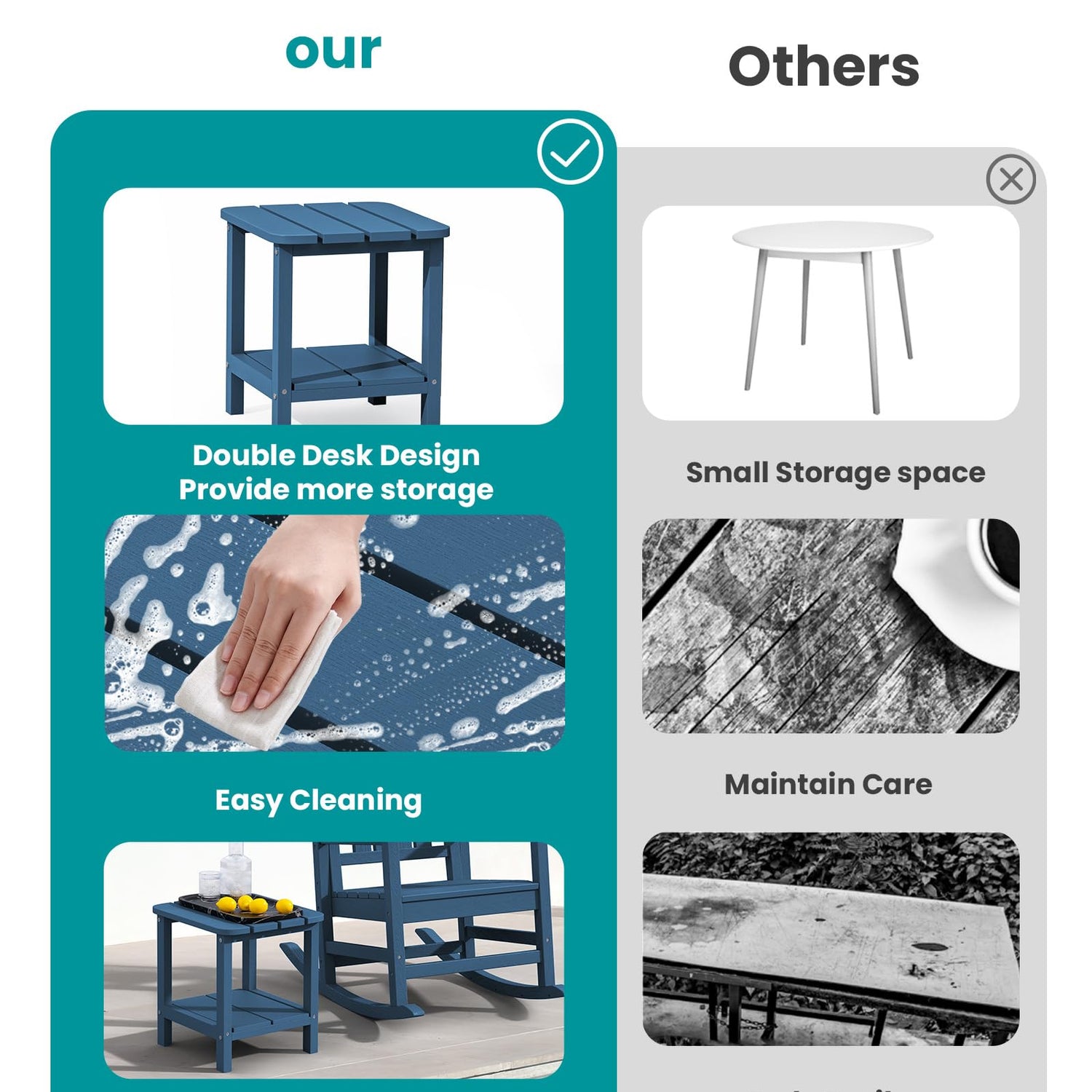 - WEATHER RESISTANT & FADE-PROOF: Our side tables are made of the polystyrene material with a textured grain finish and the realistic wood-like look. SERWALL Adiorndack desk will never fade, splinter, crack, chip, peel, or rot when exposed to the elements.