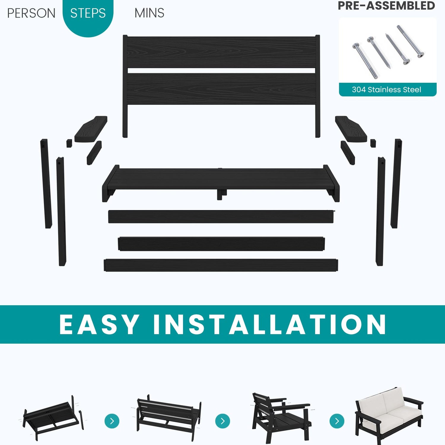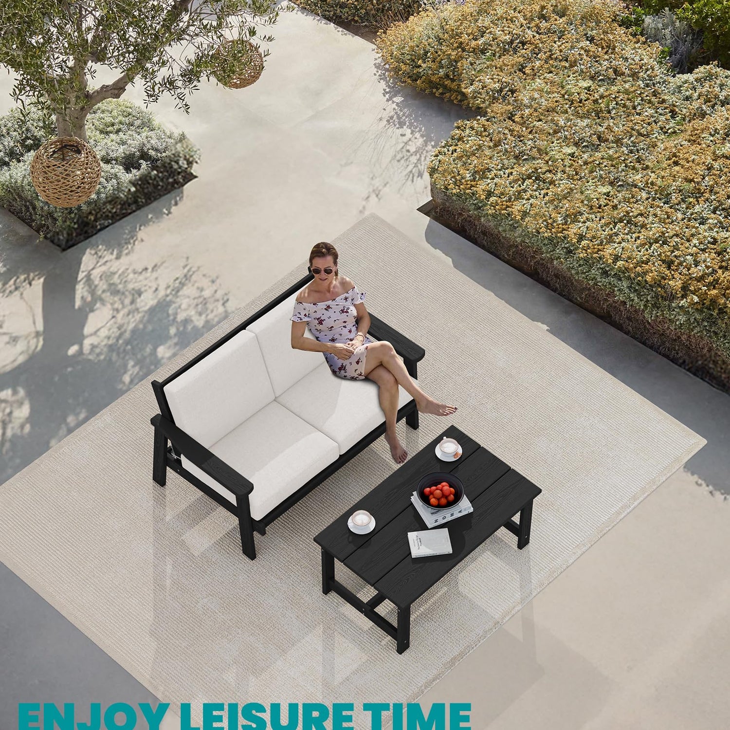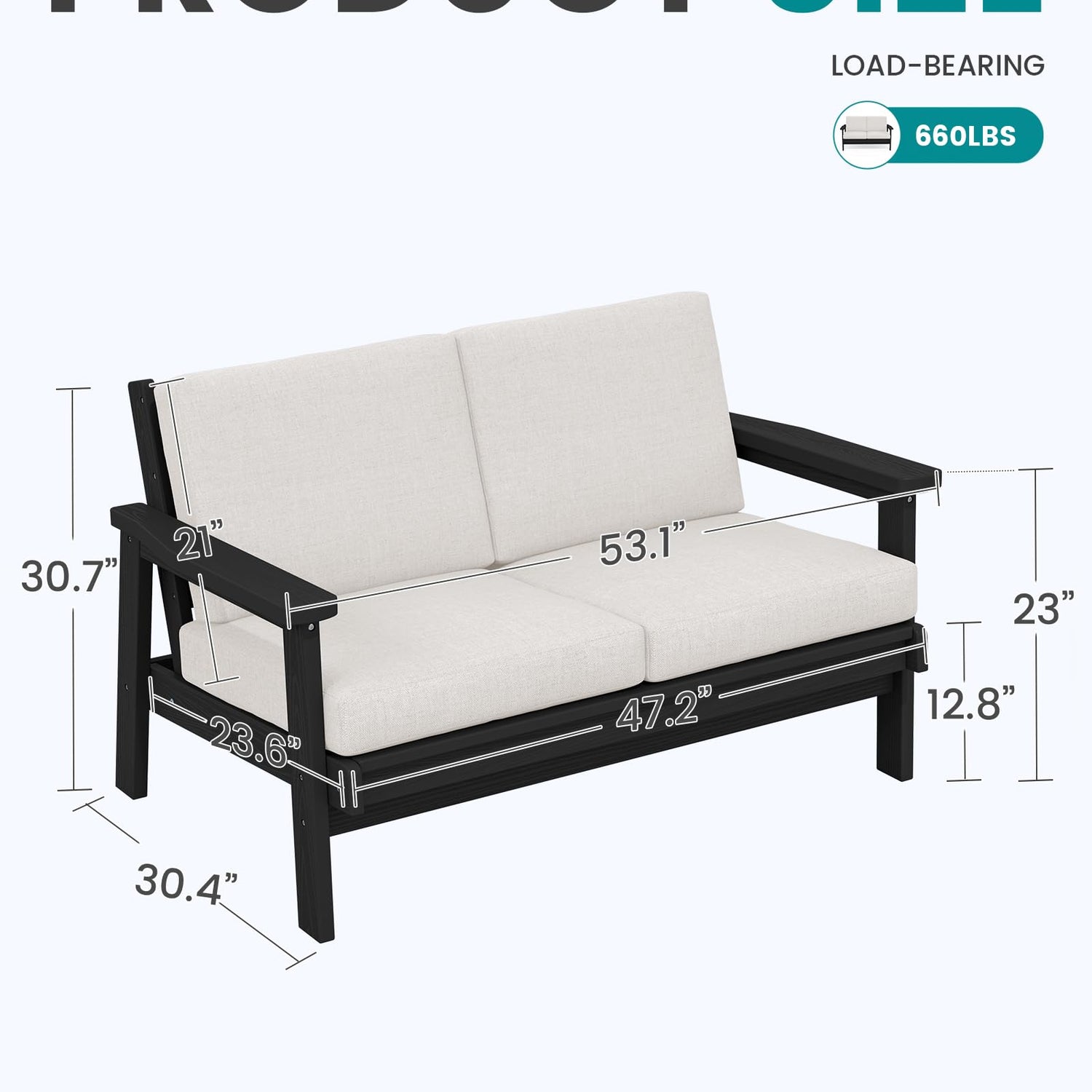 SERWALL HDPE Outdoor Patio Loveseat, Black Frame and Khaki Cushion