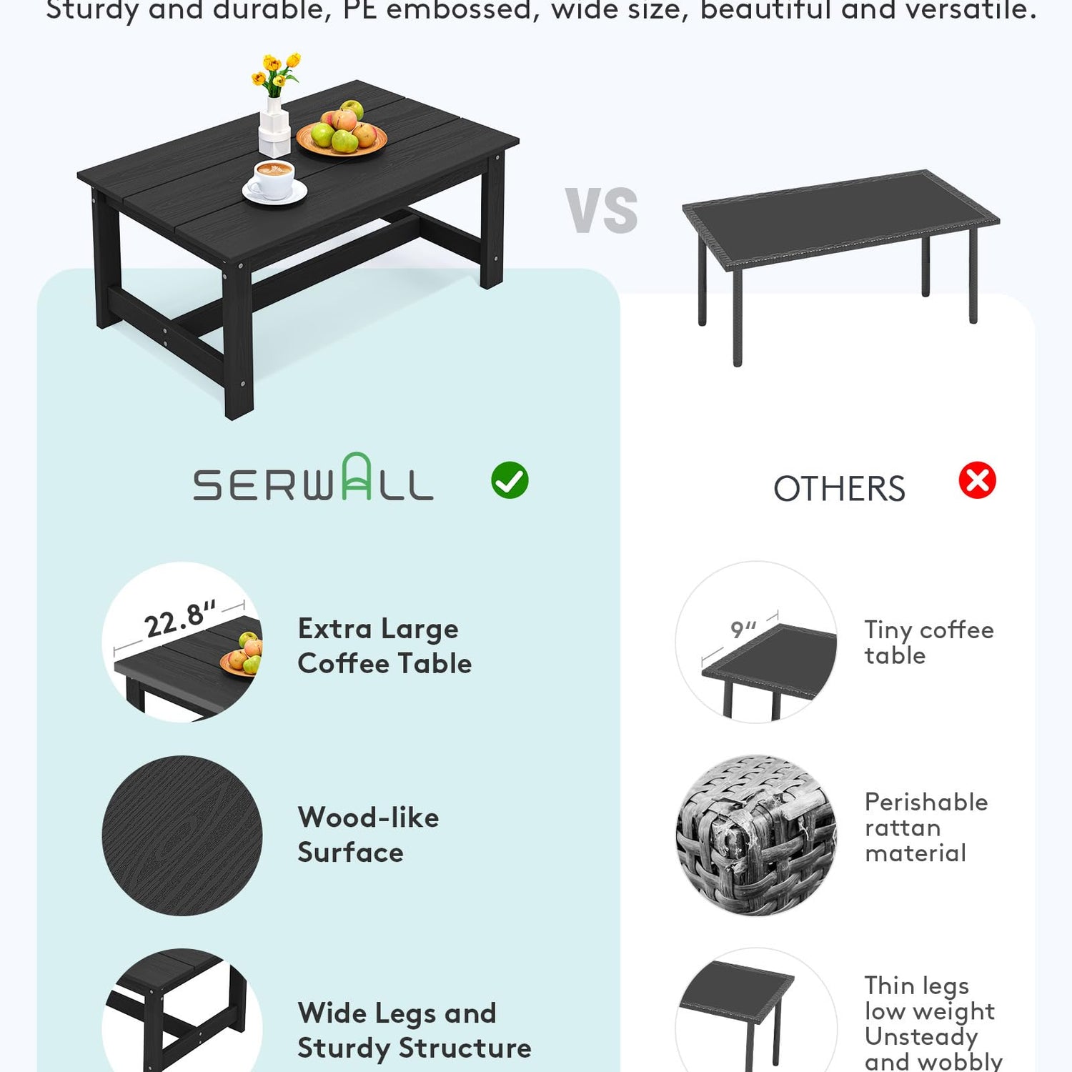 - Easy to Maintain: Made with HDPE materials that are easy to clean, the SERWALL Outdoor Coffee Table requires minimal upkeep. Simply rinse with soapy water or wipe down with a cloth for effortless maintenance. Spend more time relaxing and less time worrying about upkeep with this low-maintenance coffee table