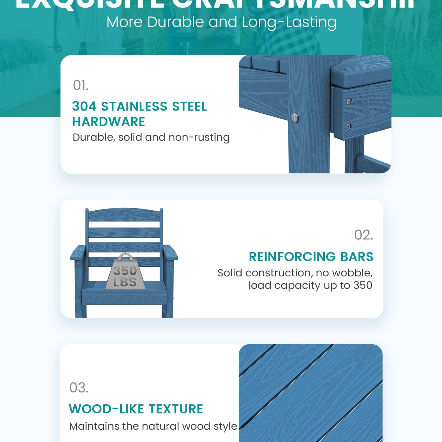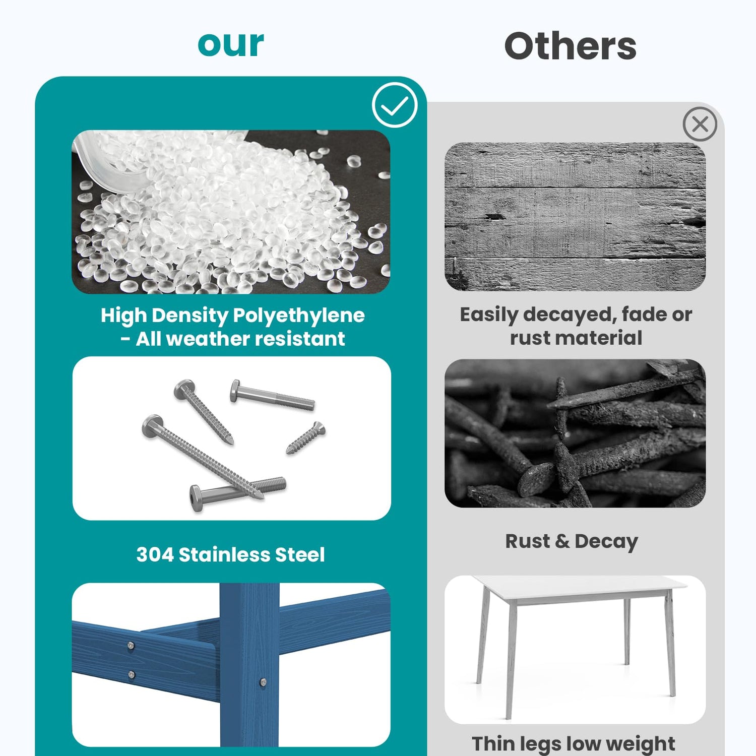 - Sturdy and Durable: Serwall outdoor furniture crafted from recyclable HDPE (High-Density Polyethylene), this material is built to withstand extreme weather conditions, including intense sun, freezing temperatures, strong winds, and heavy rain, all while maintaining its original color.