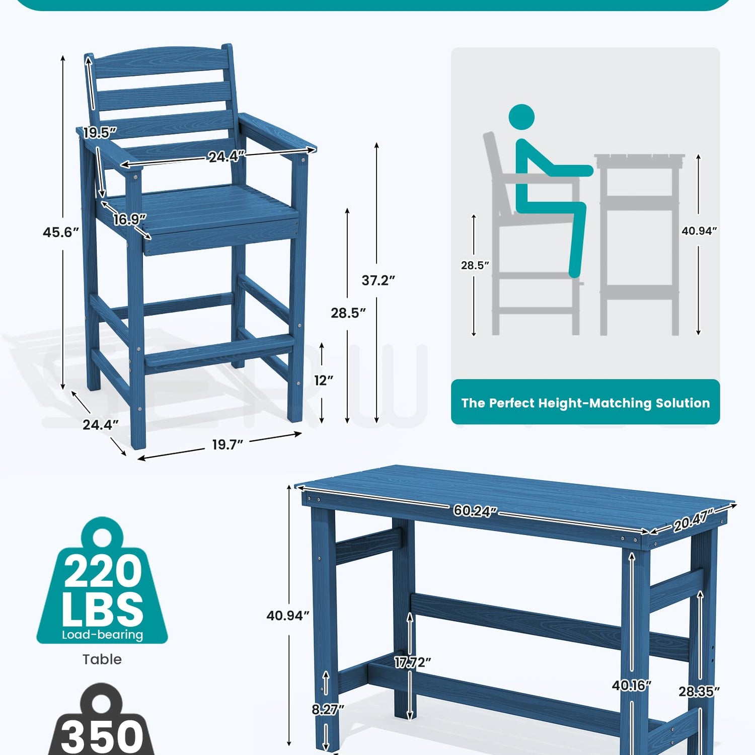 - All-weather Bar Stool Set: 2-piece Adirondack Bar Chairs (24.4"W x 24.4"D x 45.6"H) with 350 lbs weight capacity per chair; 1 piece Adirondack Bar Table(60.24"W x 20.47"D x 40.94"H) with 220 lbs weight capacity. Perfectly matched heights provide a wide view and a comfortable seating experience.