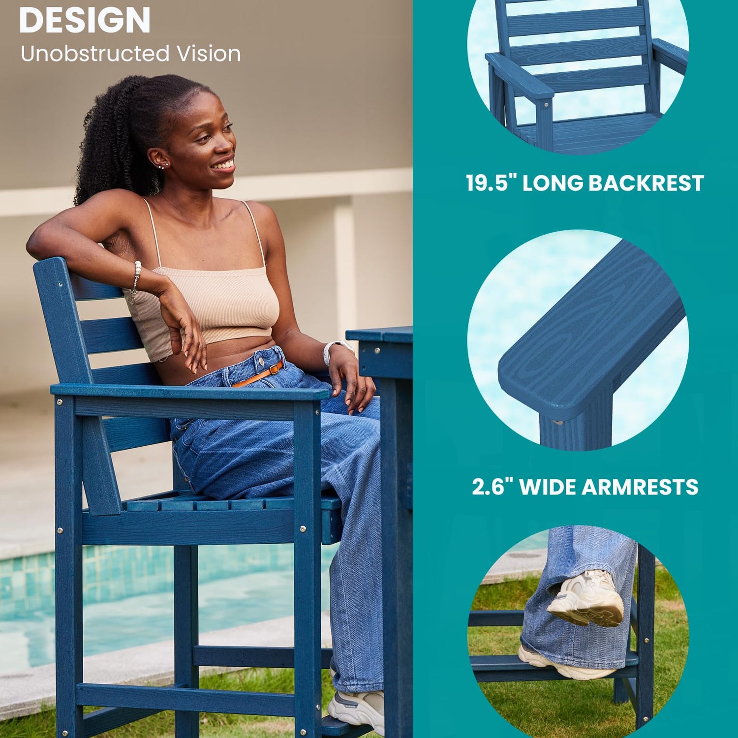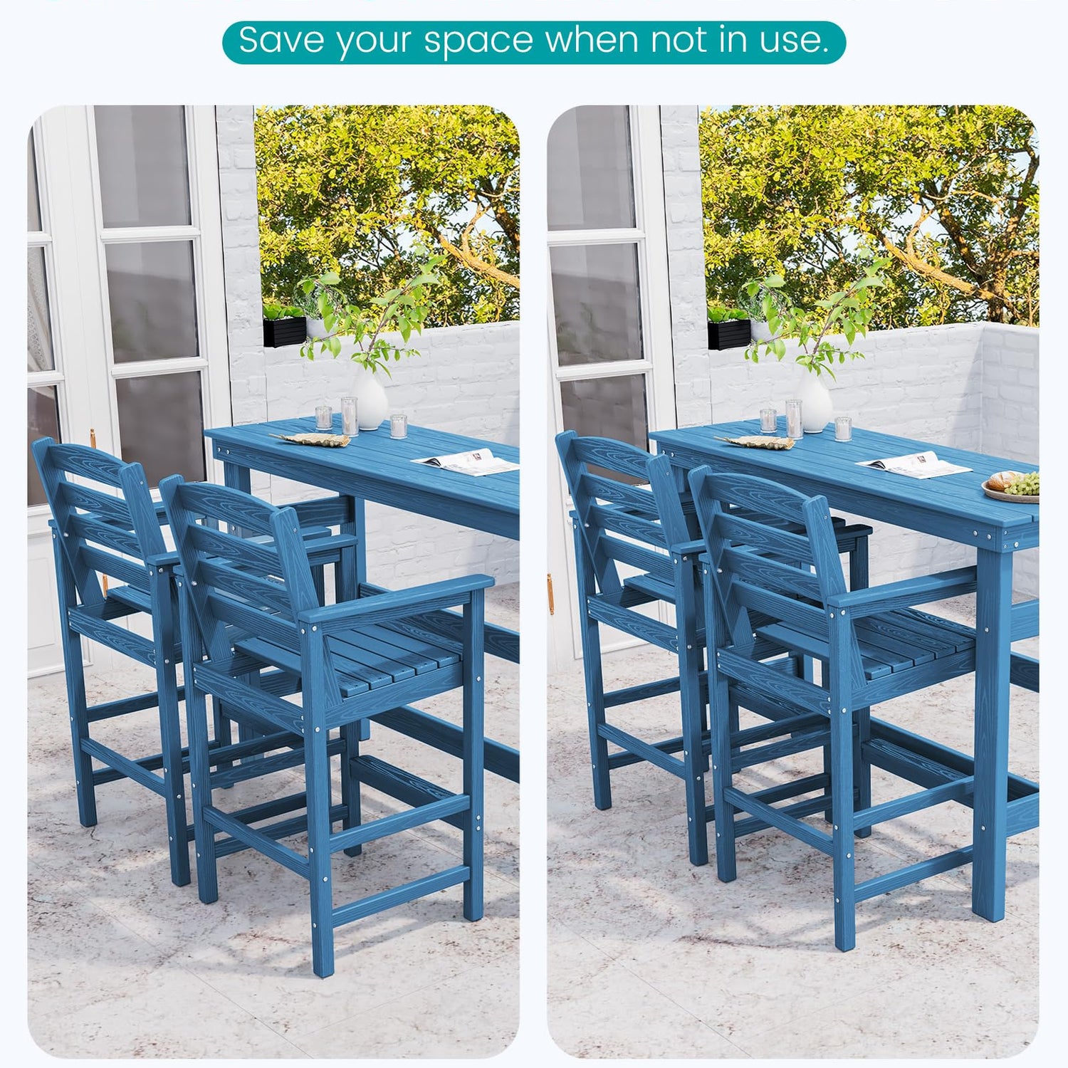 - Waterproof & Quick-Drying: Our high top patio table and chairs are made from waterproof High-Density Polyethylene (HDPE), and the slatted design allows rainwater to drain quickly, ensuring the surface dries rapidly after a downpour. This makes them an ideal choice for outdoor poolside use.