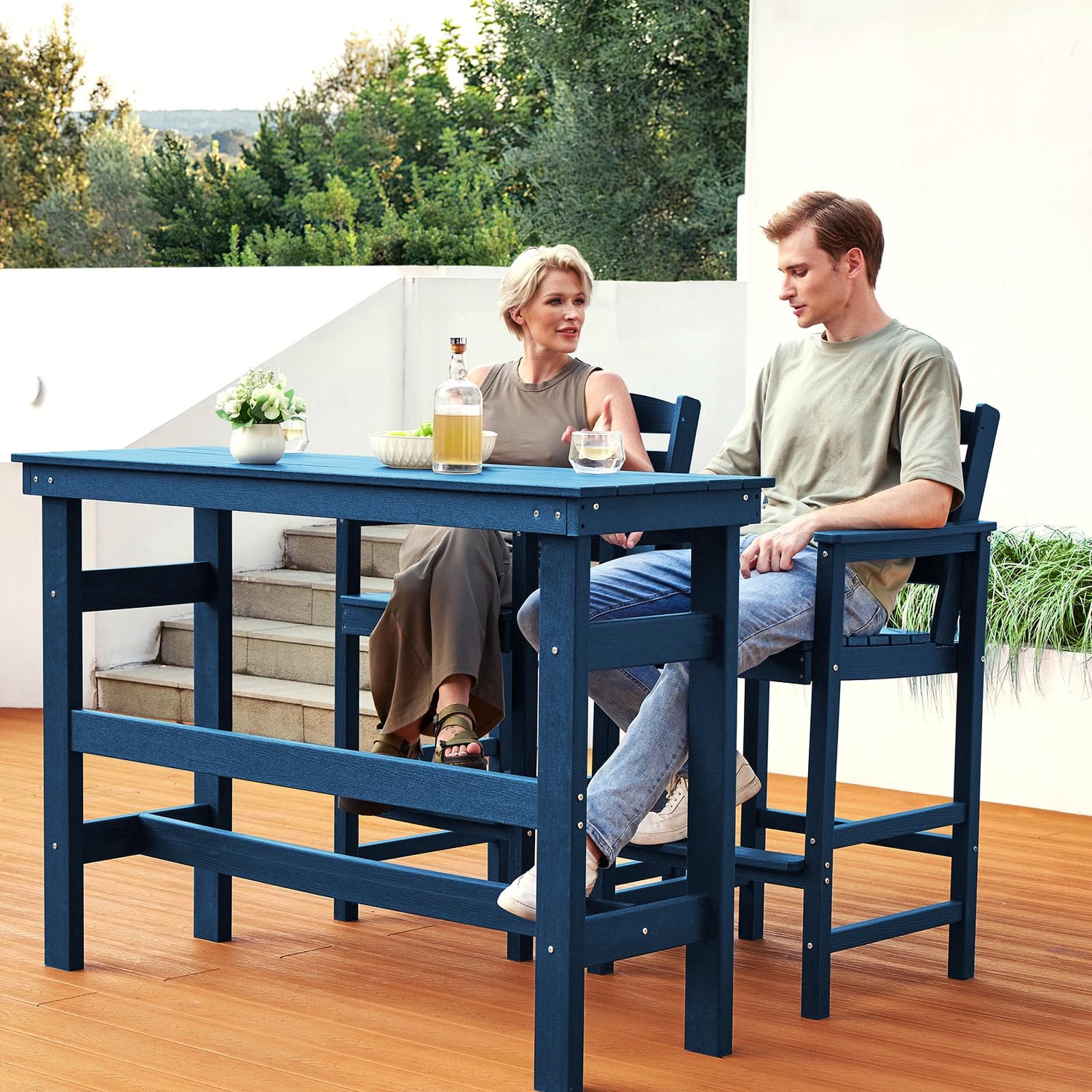 - Wood-Grain Texture: Inspired by nature, this outdoor bar table set features a wood-grain design that beautifully blends rustic charm with modern style. It's the perfect addition to any outdoor space, including patios, gardens, poolside, and terraces.
