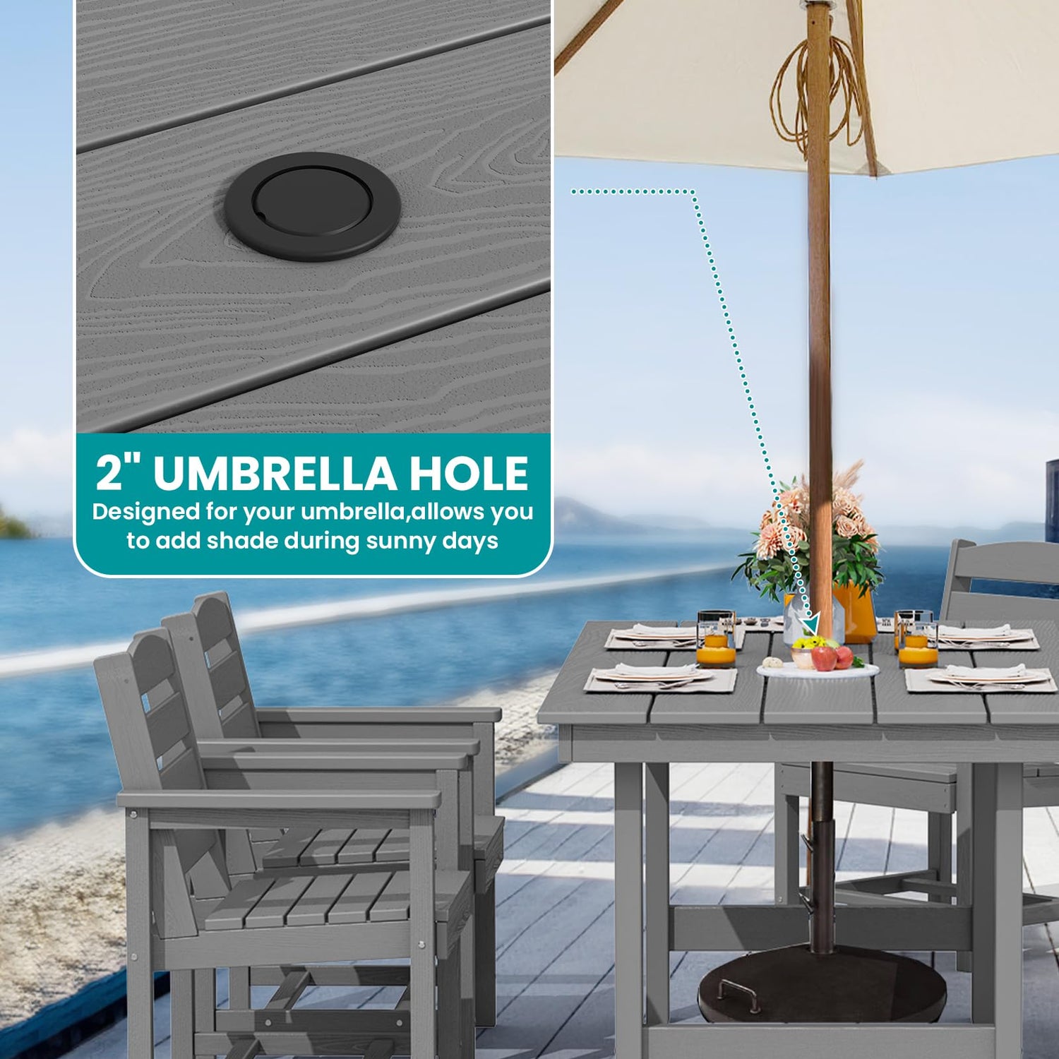 SERWALL Outdoor HDPE Dining Table Set, 7-Piece Outdoor Dining Table Sets with Umbrella Hole Cut-Out Table and 6 Chairs, Gray