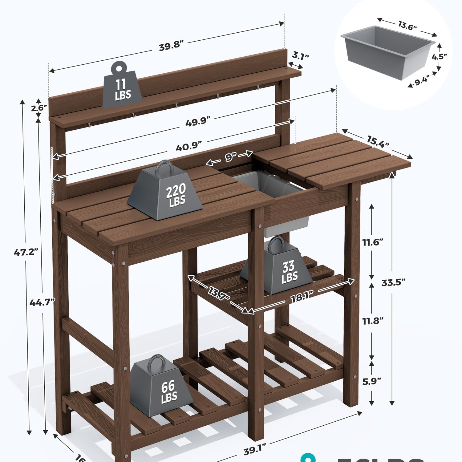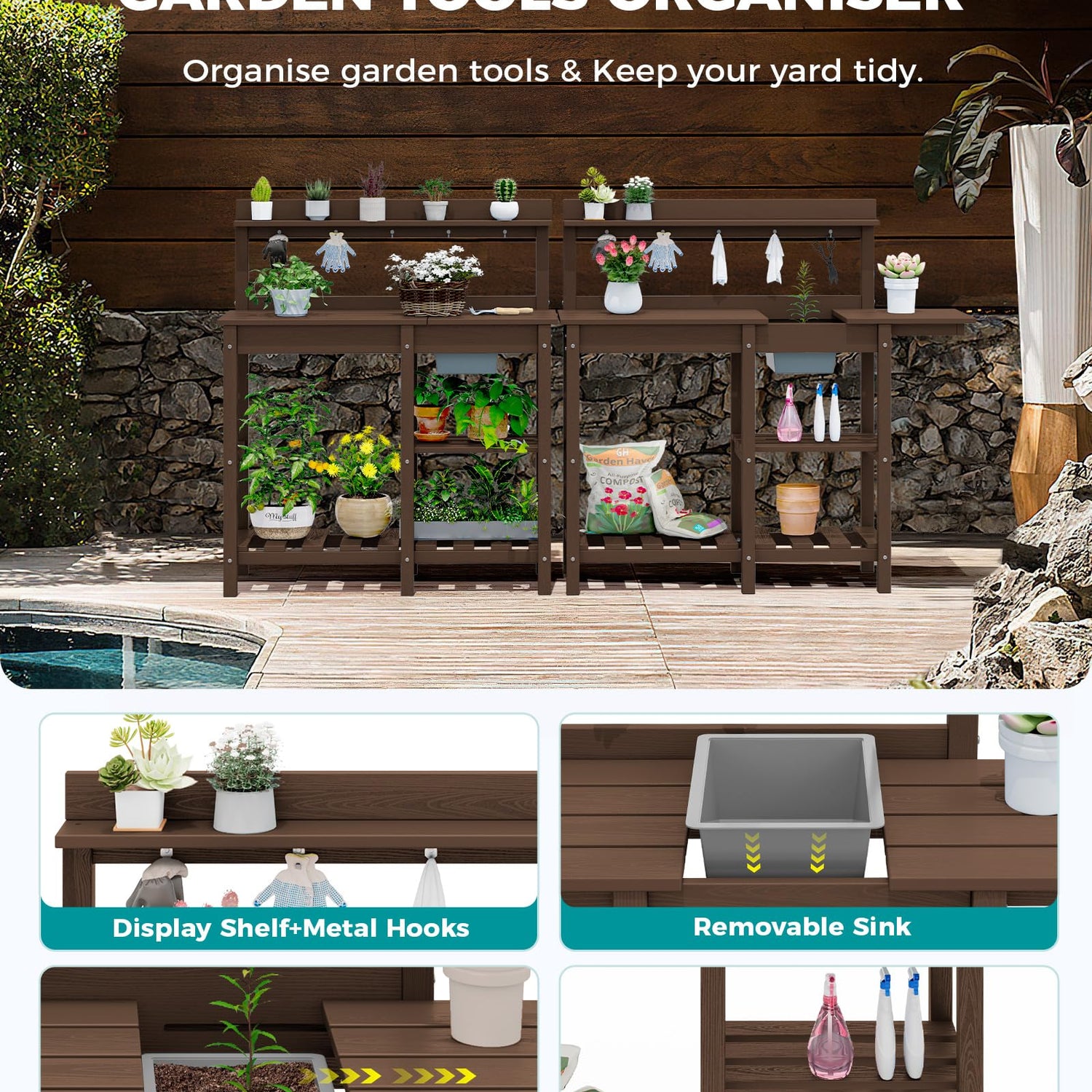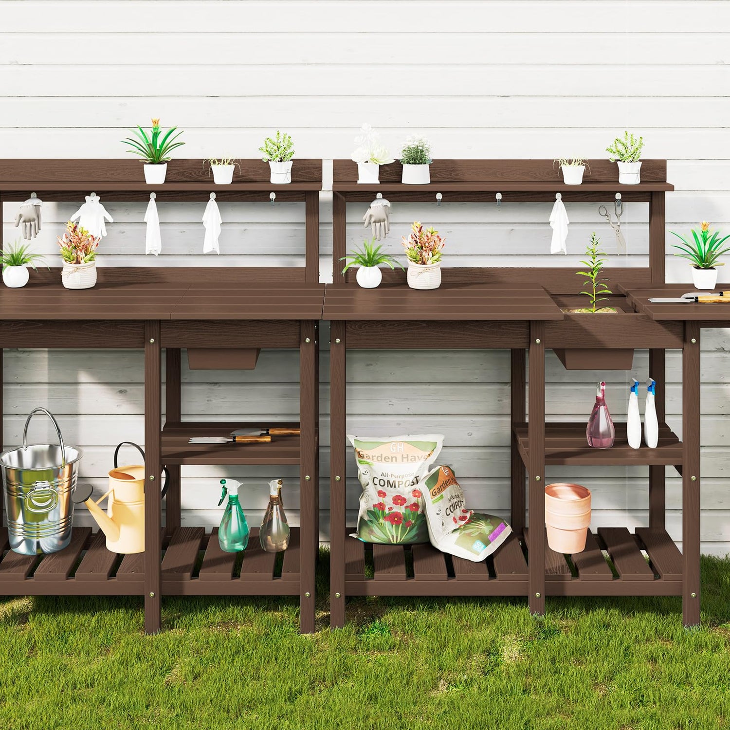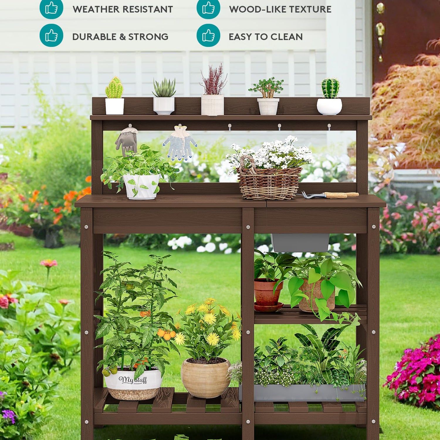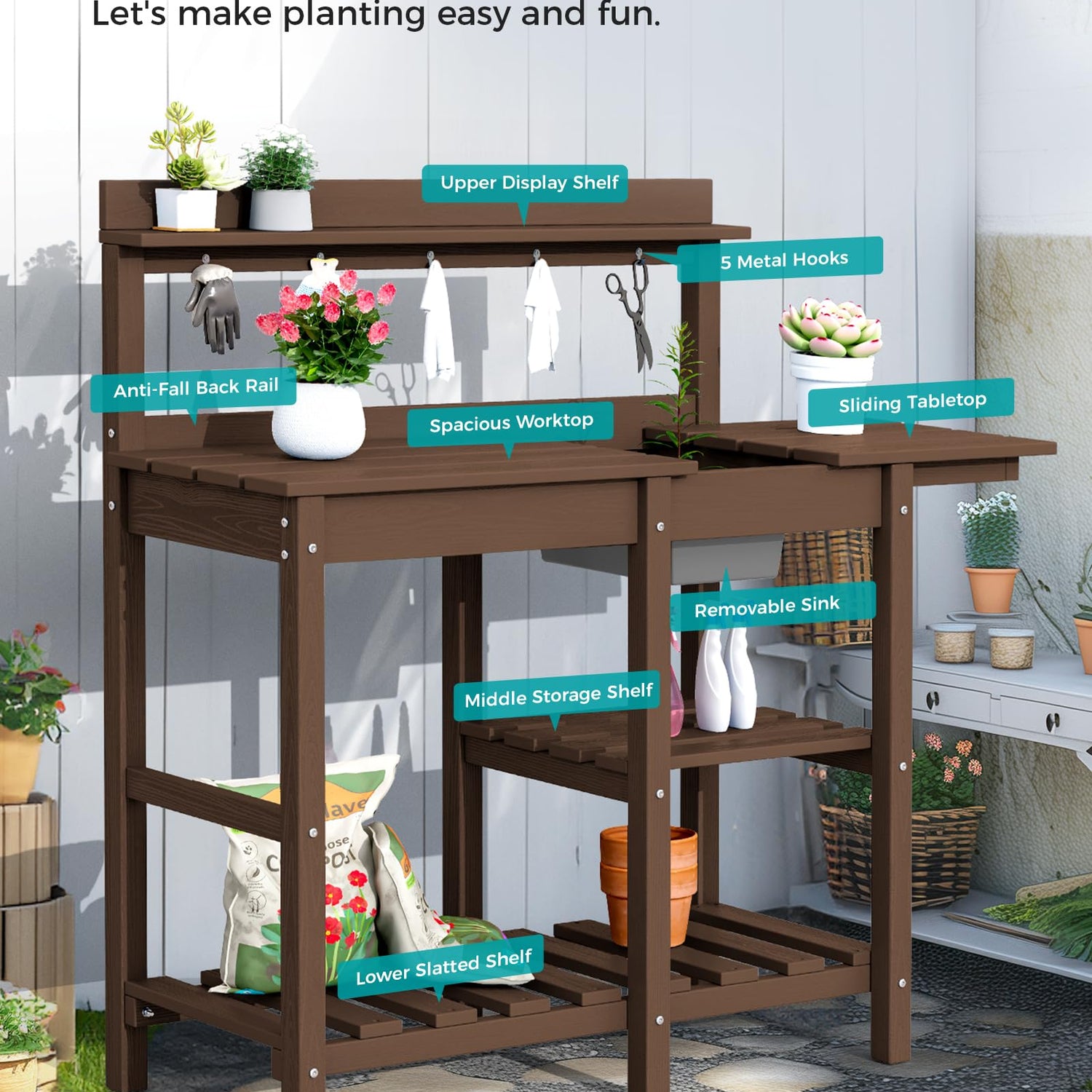 SERWALL Outdoor Potting Bench with Removeable Sink,Rot-Resistant HDPE Potting Table for Outside Gardening, All Weather Use - Coffee