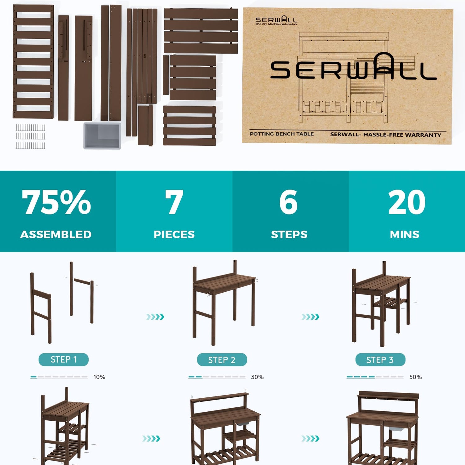 - Easy Assembly: The SERWALL potting bench with storage is easy to assemble. It comes with all the necessary tools and hardware. By following the step-by-step instructions, you can assemble this planting table within 20 minutes.