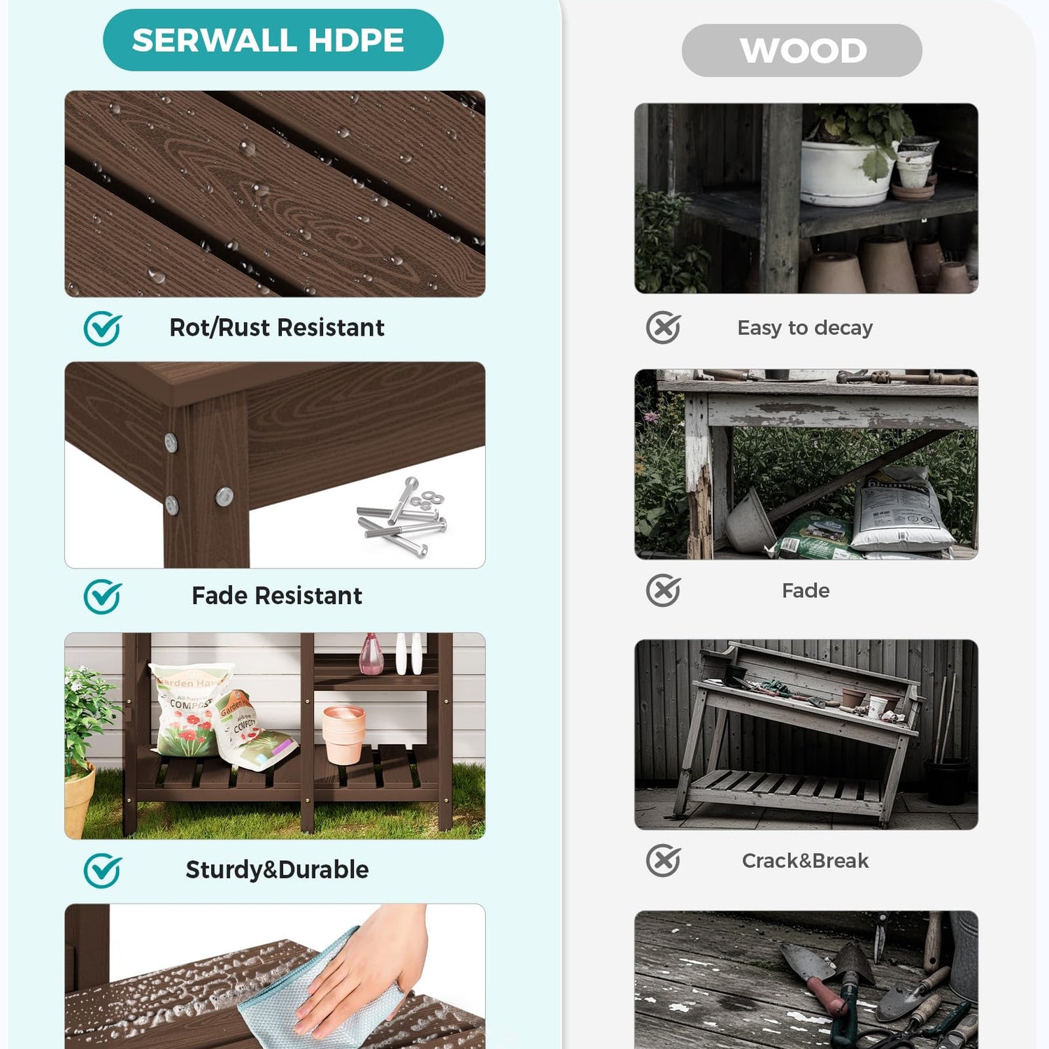 - HDPE Material: Constructed from 100% HDPE material, the SERWALL outdoor potting bench offers high strength and stability, ensuring a long service life. Potting bench table is durable for outdoor use in any weather condition.