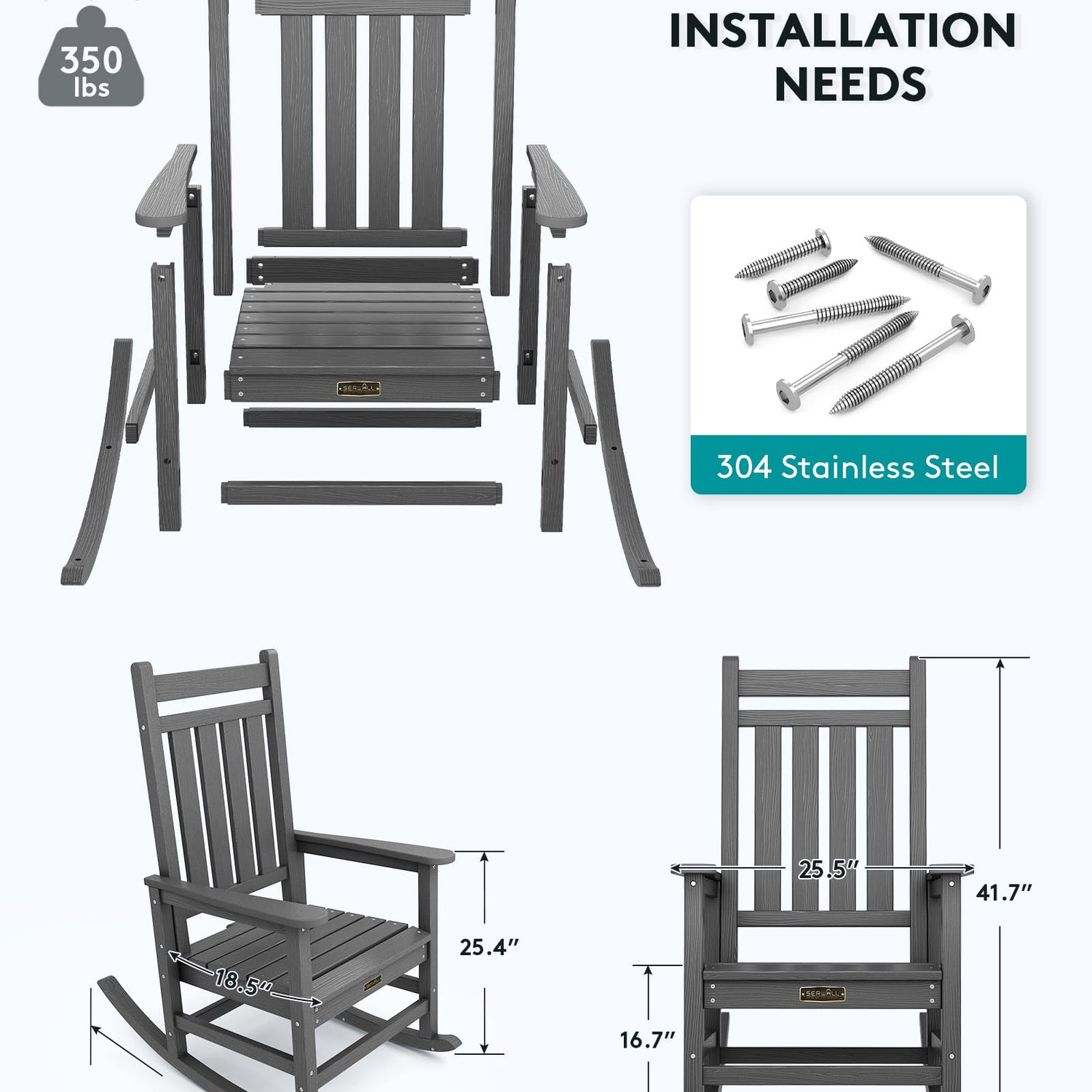 - 【Long Lasting】Made of high density polyethylene and 304 stainless steel hardware, this outdoor rocker can withstand most of the extreme weather. No worry about fading, cracking, rotting or chipping. The premium HDPE material makes up for the disadvantages of wood and HIPS, adds more stability and durability.