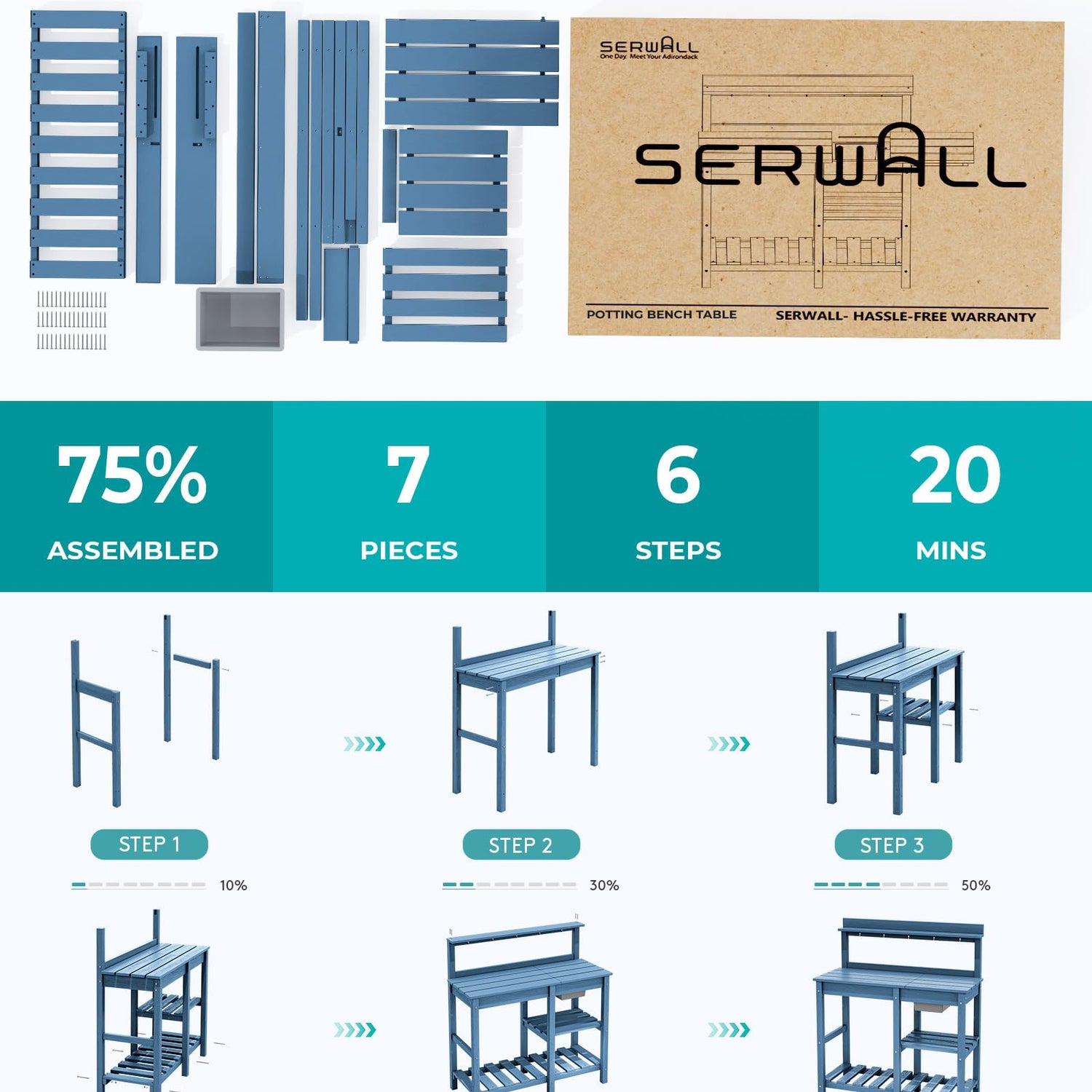 - Easy Assembly: SERWALL potting bench with storage requires an easy installation. It comes with all the necessary tools and hardware. By following the step-by-step instructions, you can assemble this planting table within 20 minutes.