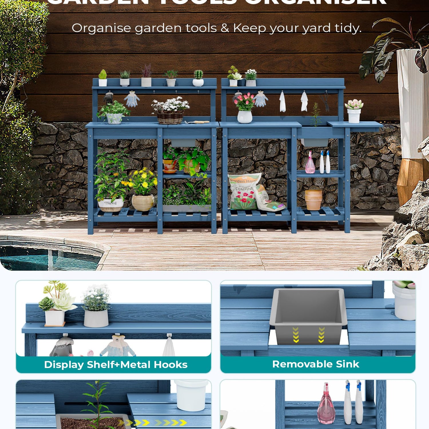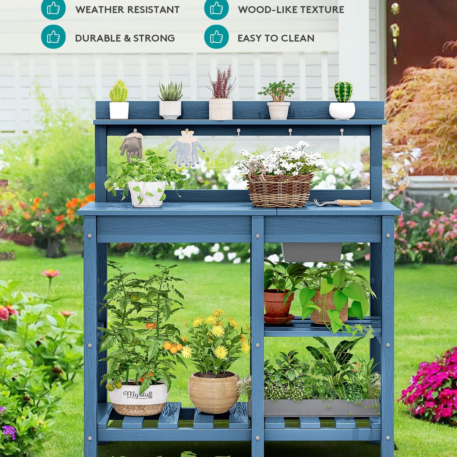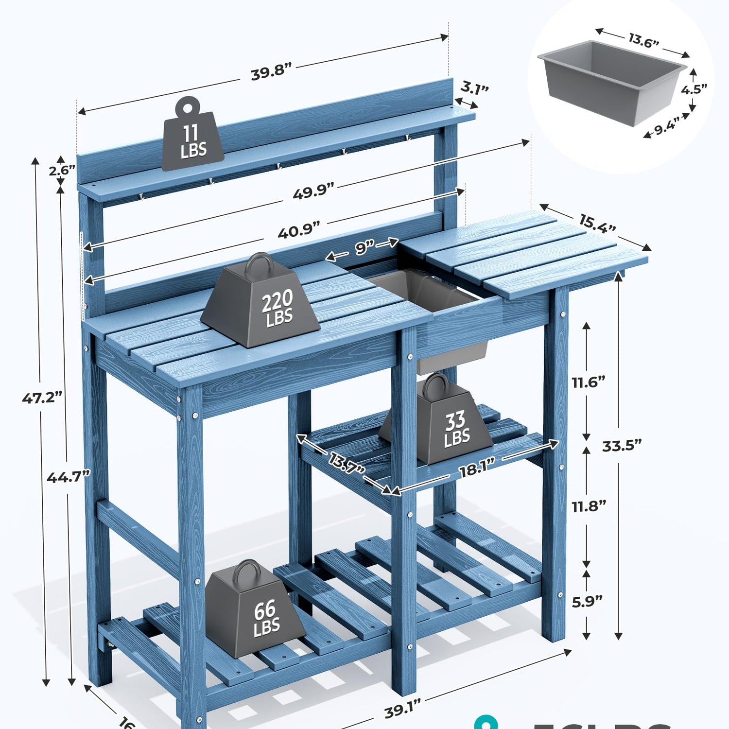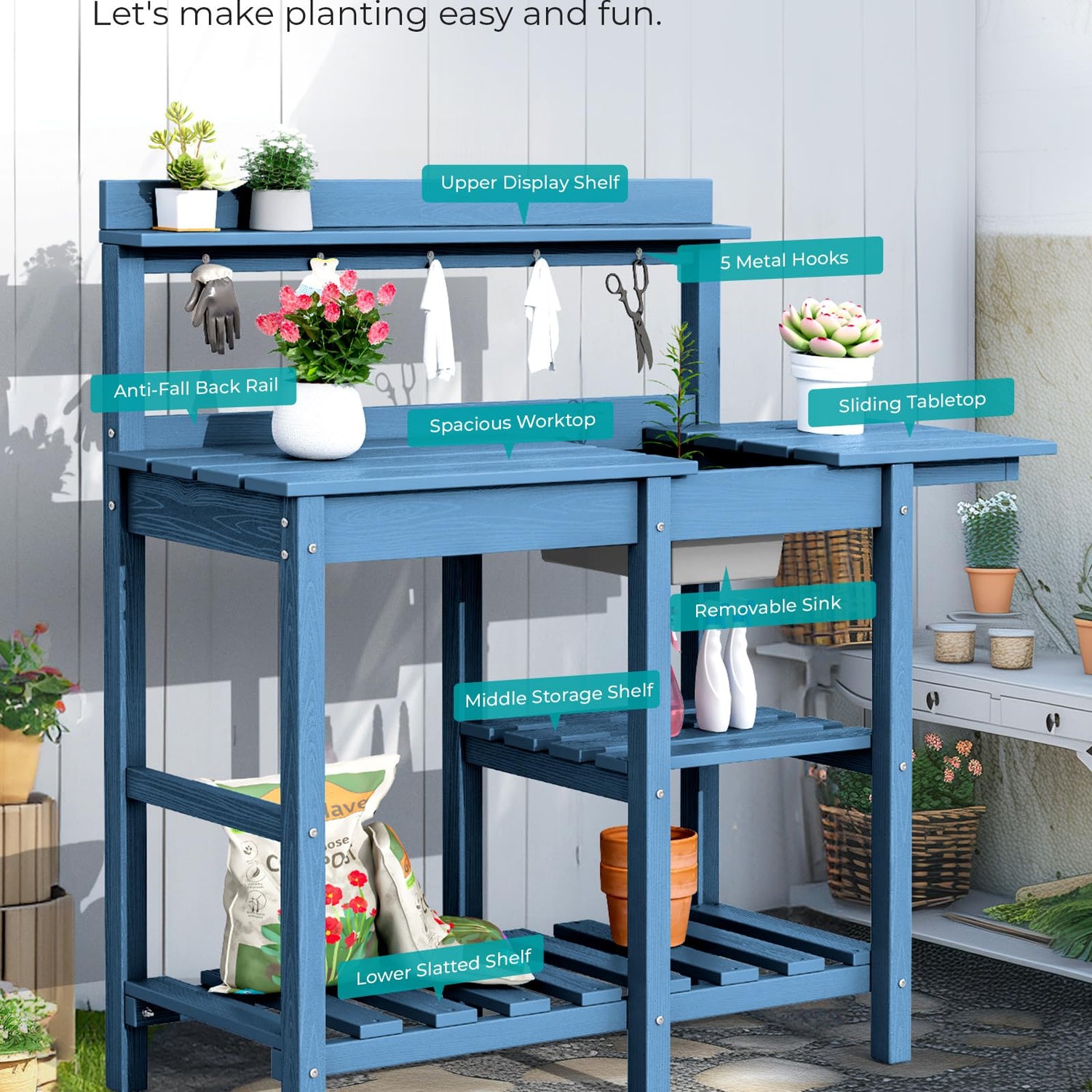 SERWALL Potting Table Outdoor Potting Bench with Sink, HDPE Potting Benches for Outside All Weather Use- Blue