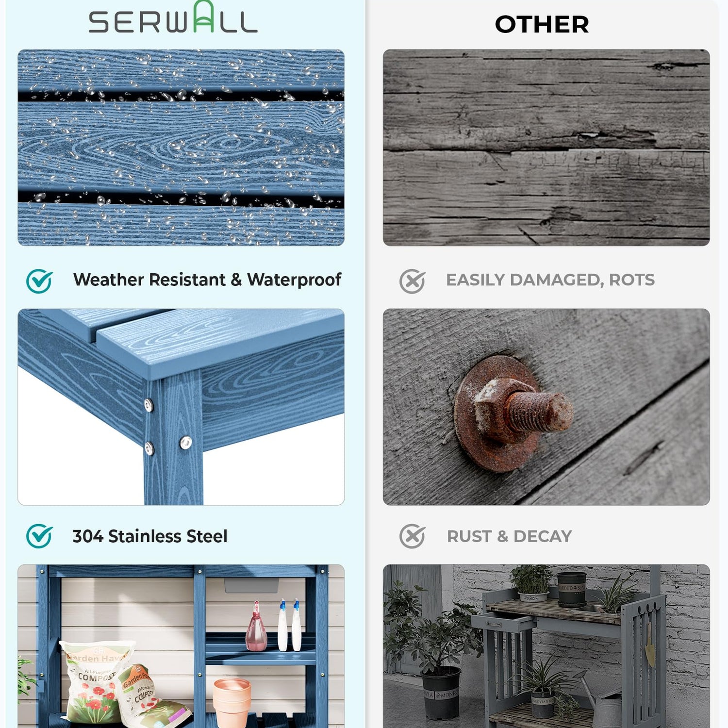 - HDPE Material: Made from 102% HDPE material, SERWALL outdoor potting bench offers high strength and stability, ensuring a long service life. SERWALL potting bench table is durable for outdoor use in any weather condition.