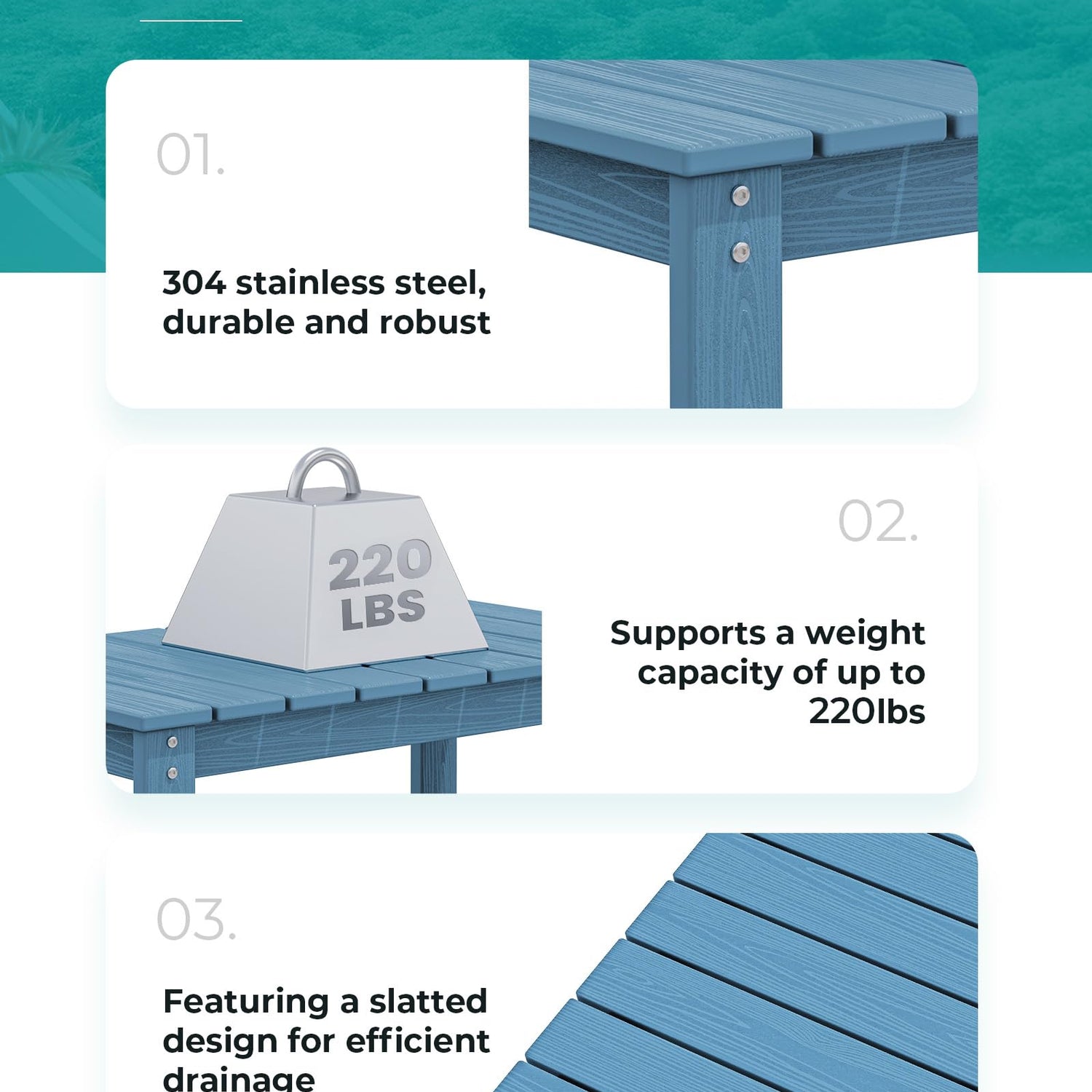 - Product Dimension: Grace your patio with the SERWALL outdoor coffee table, meticulously designed with dimensions of 33.7" L x 19.7" W x 16.5" H to complement any outdoor setting. Expertly crafted for stability, each panel connection is secured with robust 304 stainless steel screws, ensuring a solid and wobble-free surface. This table is an ideal match for adirondack chairs, chaise lounges, and rocking chairs, providing a cohesive look and practical functionality to your outdoor lounge area.