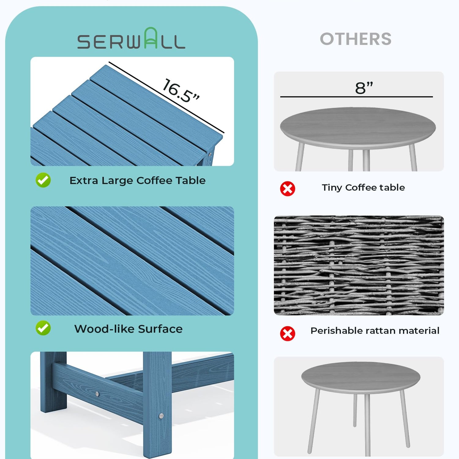 - Durable HDPE Material: Expertly constructed from high-quality HDPE, a recyclable material, it can withstand a range of harsh weather conditions, such as hot sun, strong wind or heavy rain, and still retain its original color. This SERWALL coffee table is designed to withstand all weather conditions, ensuring long-term use in both indoor and outdoor environments.
