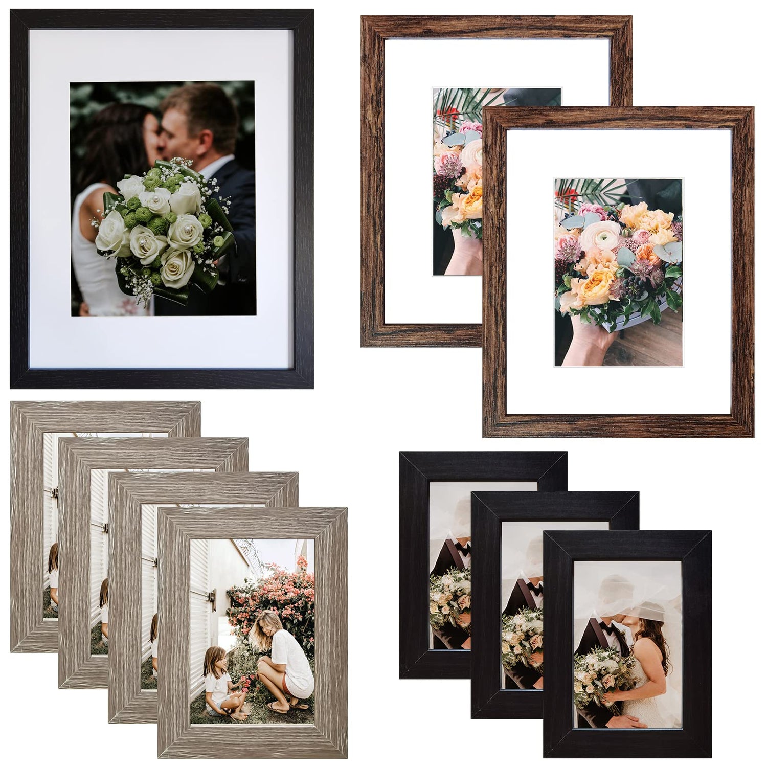 - Multi-size: 10pcs picture frames set come with ONE black frame 11x14in with mat for 8x10 photo, TWO wood grain brown frames 8x10in with mat for 5x7 photo, FOUR gray frames 5x7in, THERE black frames 4x6in. Come with HD plexiglass to protect your picture(Please tear off the protective film before use, there is a protective film on both sides of the plexiglass).