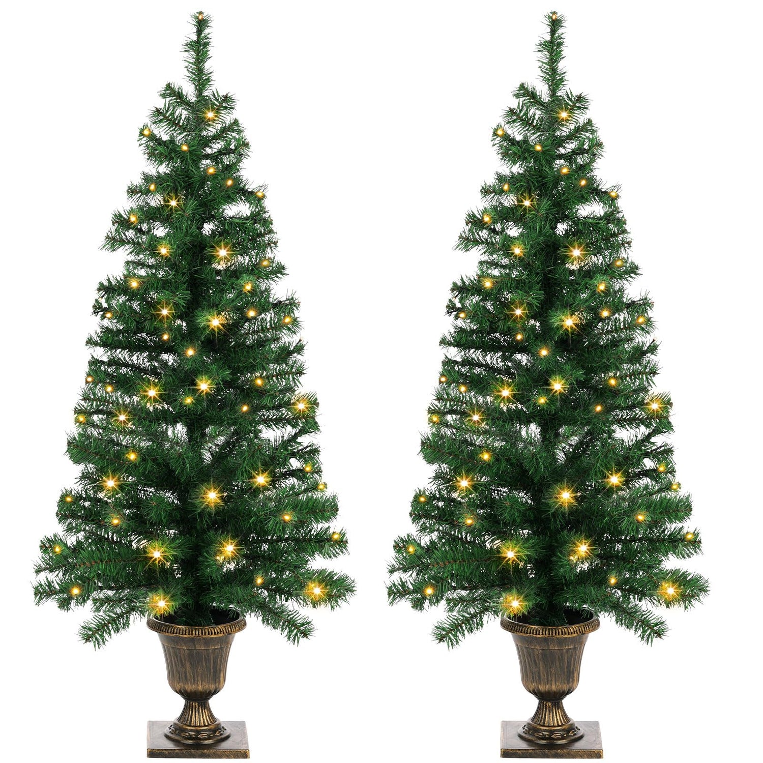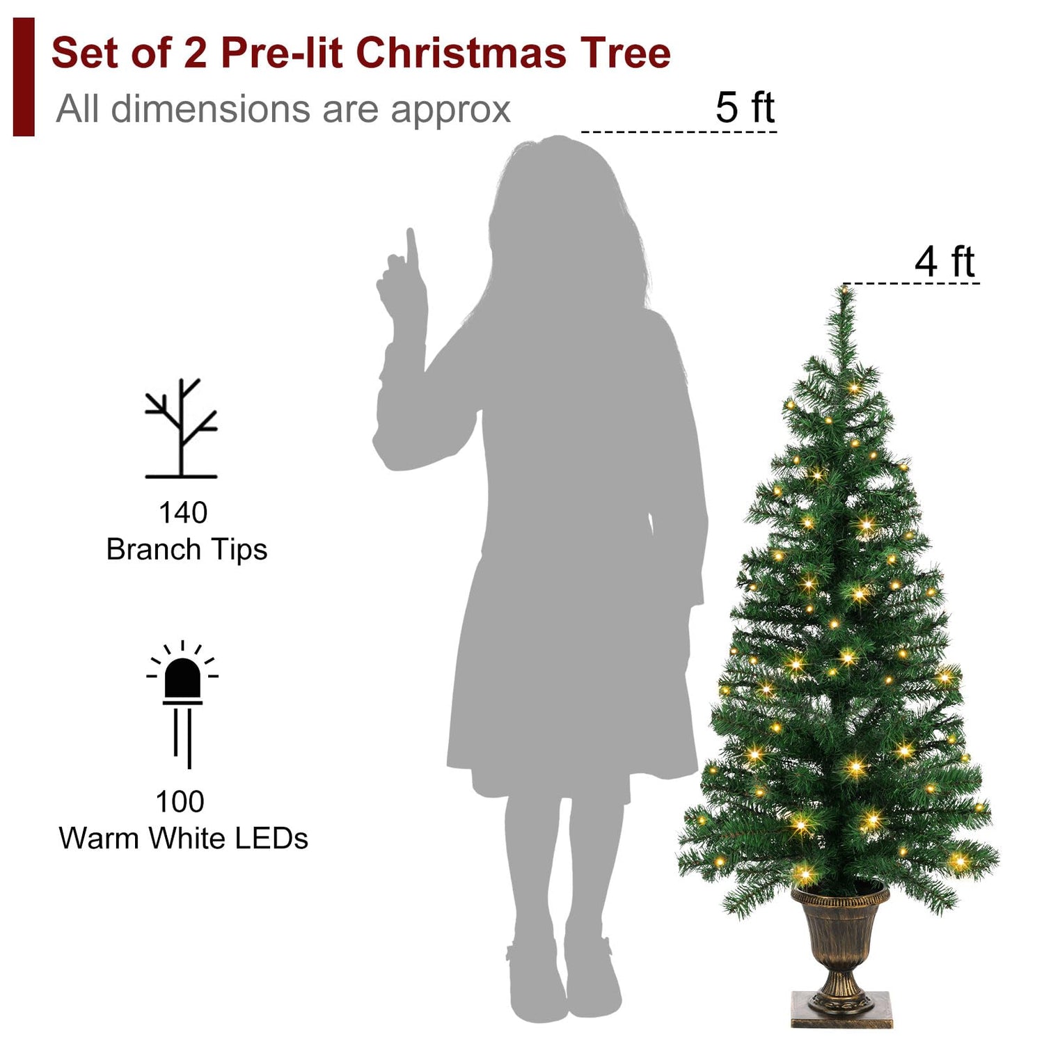 Set of 2 Christmas Trees with Lights 4-FT Artificial Urn Potted Porch Christmas Tree Battery Powered with 8 Modes and Timer for Indoor Outdoor