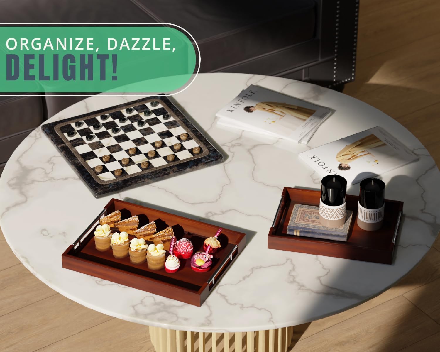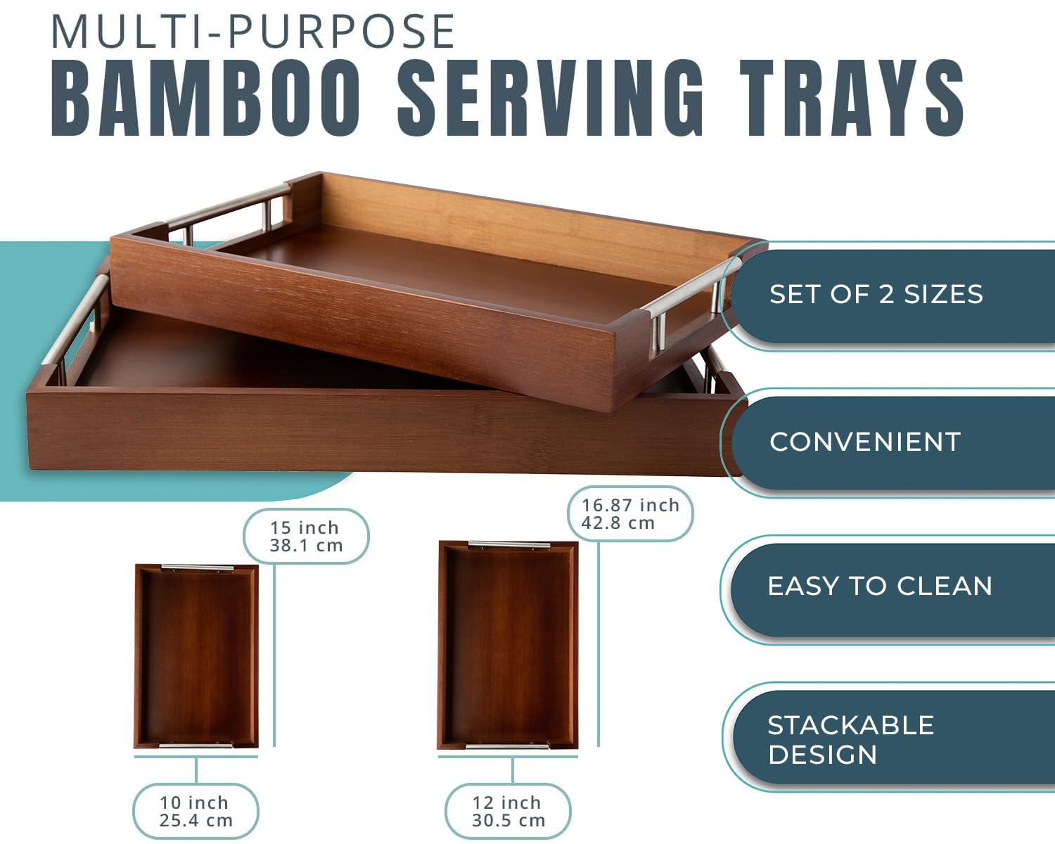 Set of 2 Decorative Serving Trays - Bamboo + Silver Stainless Steel Handles - Coffee Table or Ottoman Tray for Breakfast in Bed Jewelry, Decor Organization - 12"x17" - Stained Brown Finish
