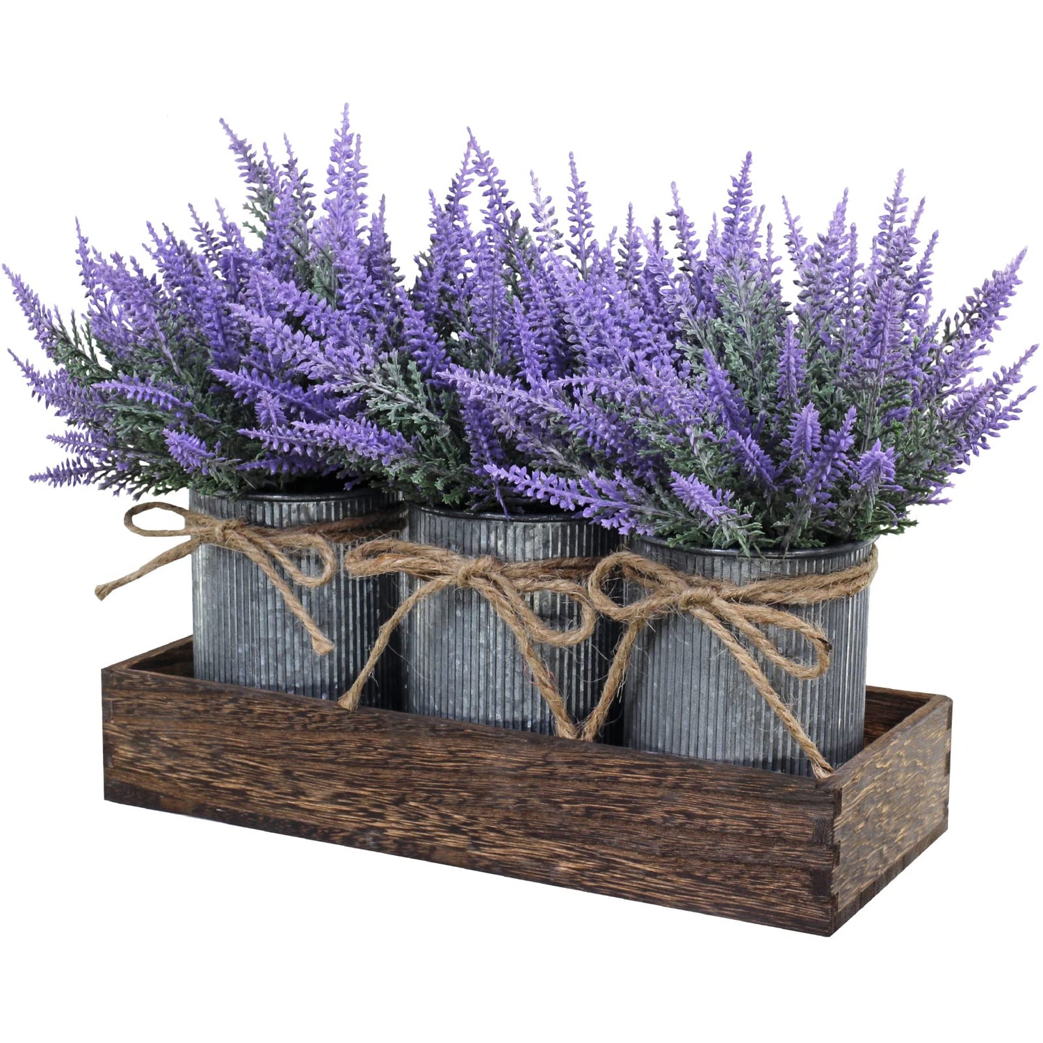 - Quantity: Package includes 1 piece rectangular wooden planter box and 3 pcs rustic galvanized metal pots with 3 pcs fake lavender bushes. The galvanized pots and faux lavender flower plants come separately, so you can choose to accent your lavender with other floral stems or a little garden marker sign to create a unique floral arrangement. Set of 3 matching potted plants makes a great centerpiece for your farmhouse table this spring and summer, adding a welcome feel to your home or office.