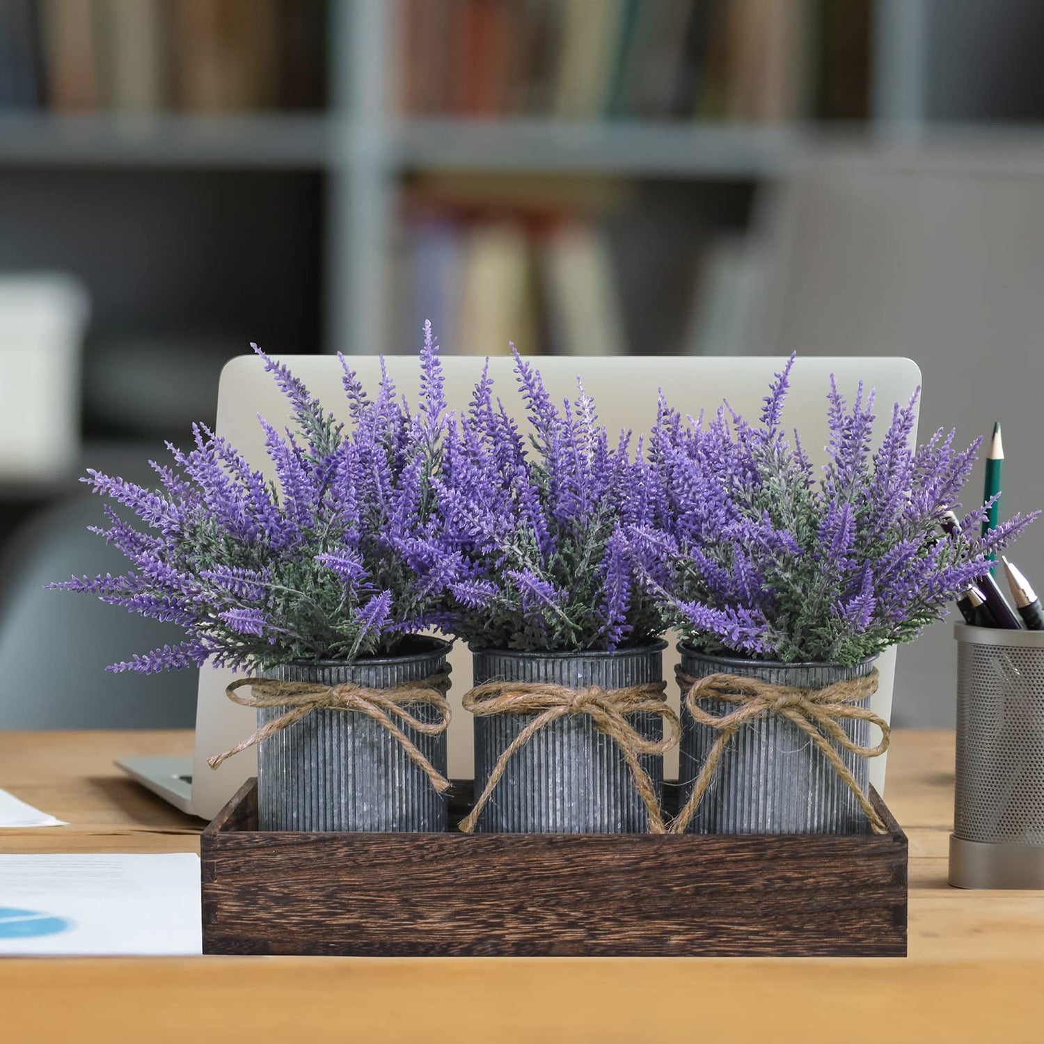 - Size: Each faux lavender bush measures about 7" tall and 8.6" wide. Each galvanized metal pot measures about 3" wide and 4.3" tall. The wooden box is about 10.9" L x 4.5" W x 2" D, when filled with the fake potted lavender flower plants measures about 16.5" L x 8" W x 9.3" H. With an ideal size, this artificial flower arrangement is the perfect addition to tabletop, kitchen windowsill, mantel, bathroom shelf, and countertop.