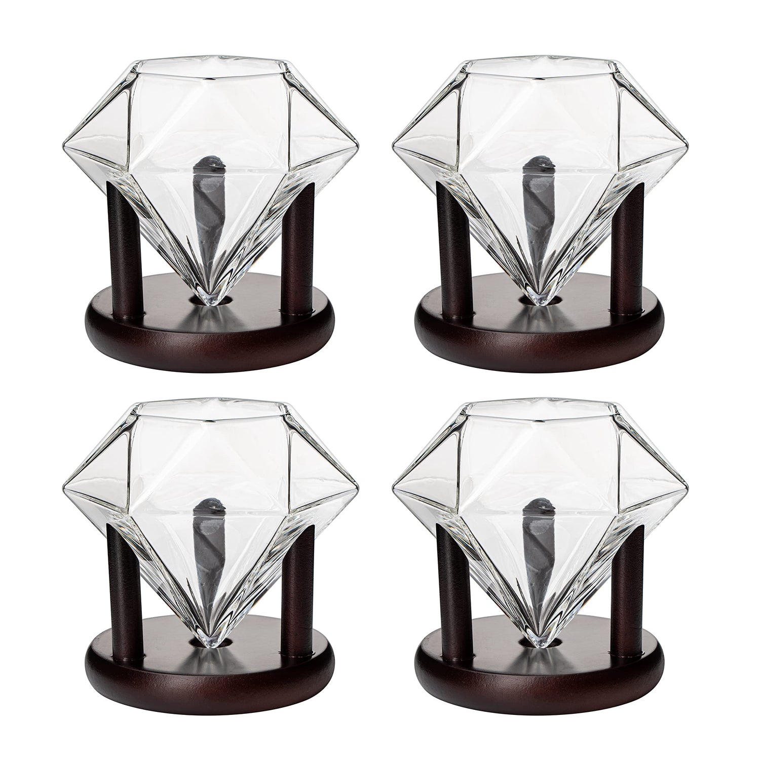 Set of 4 Diamond Whiskey & Wine Glasses With Wood Stands 10oz - Wine, Whiskey, Water, Diamond Shaped, Diamonds Collection Sparkle Patented Wine Savant - Stands Alone, Or on Stand, Cocktail Barware