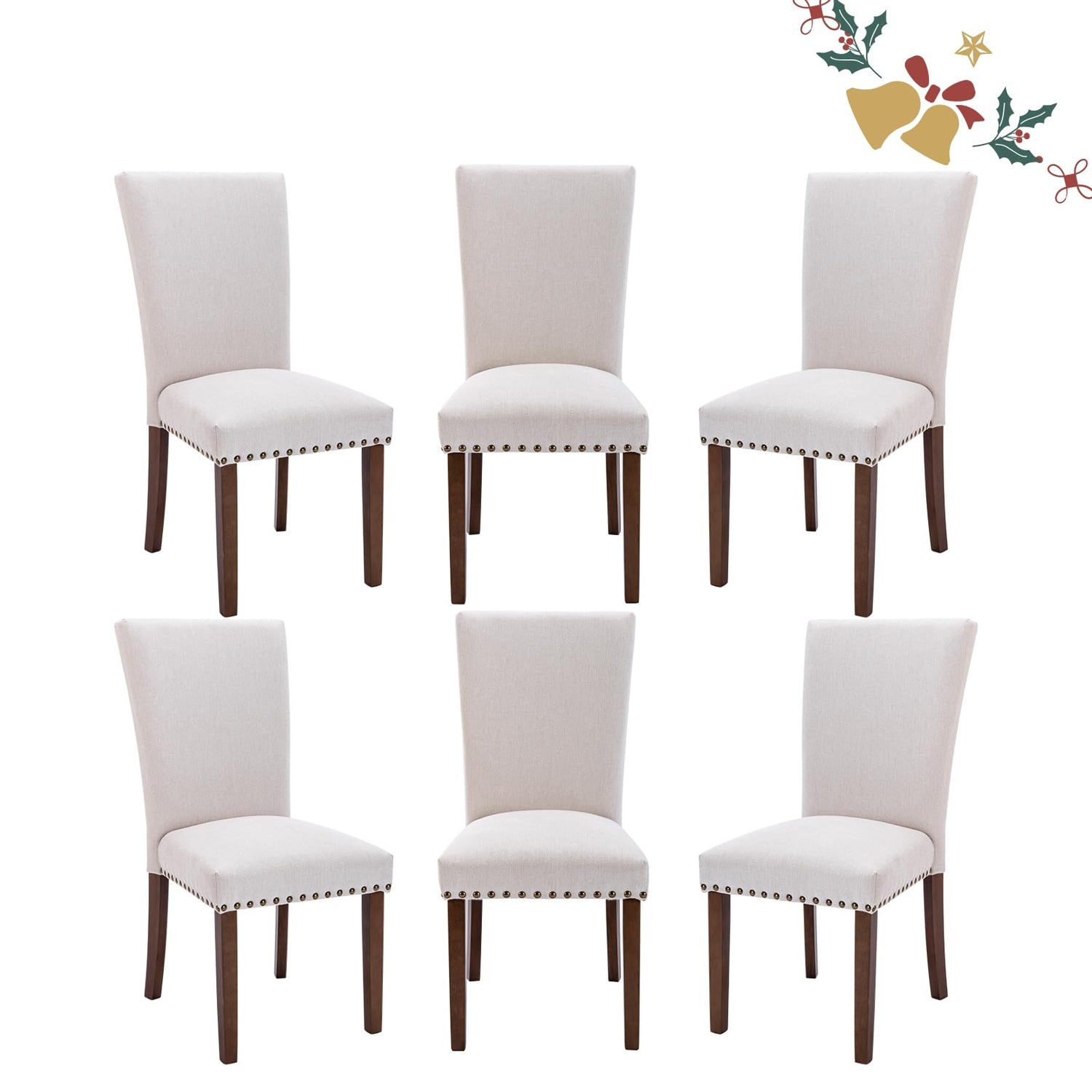 Details: Set of 6 Beige Upholstered Dining Chairs offer comfort, durability, and farmhouse charm. Featuring linen upholstery, cushioned foam seating, and bronze nailhead accents, these chairs add elegance to any dining space. With solid rubberwood legs, they provide long-lasting stability. Beige upholstered farmhouse chairs with elegant trim Comfortable padded seat and tall ergonomic backrest Durable solid wood legs support up to 250 lbs Suitable for dining rooms, kitchens, or living spaces Set of 6 chairs, ideal for large families or gatherings