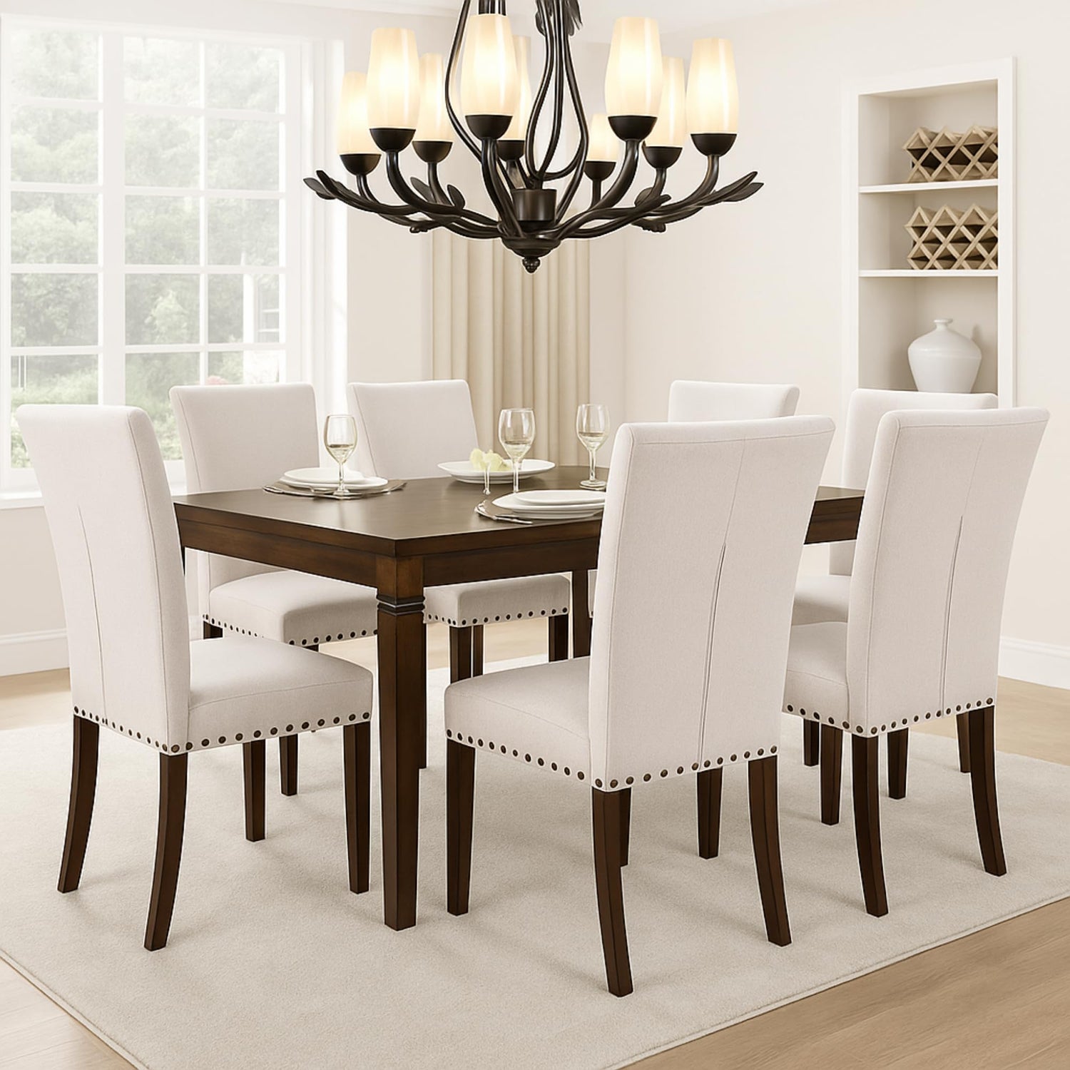 - Complete Dining Set – Set of 6 beige upholstered dining chairs with farmhouse style and bronze nailhead trim, perfect for large families or entertaining.