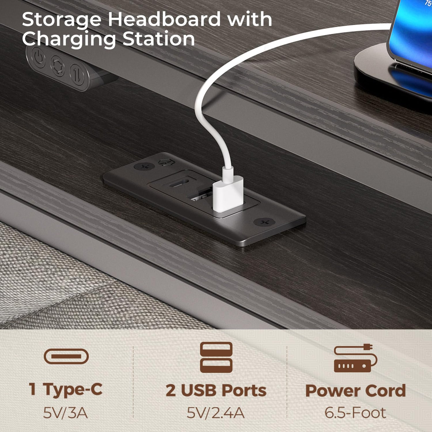 - Convenient Charging Station Bed: The headboard includes a built-in power panel with 2USB ports and 1 Type-C port, allowing you to conveniently charge your tablet, phone, or other mobile devices