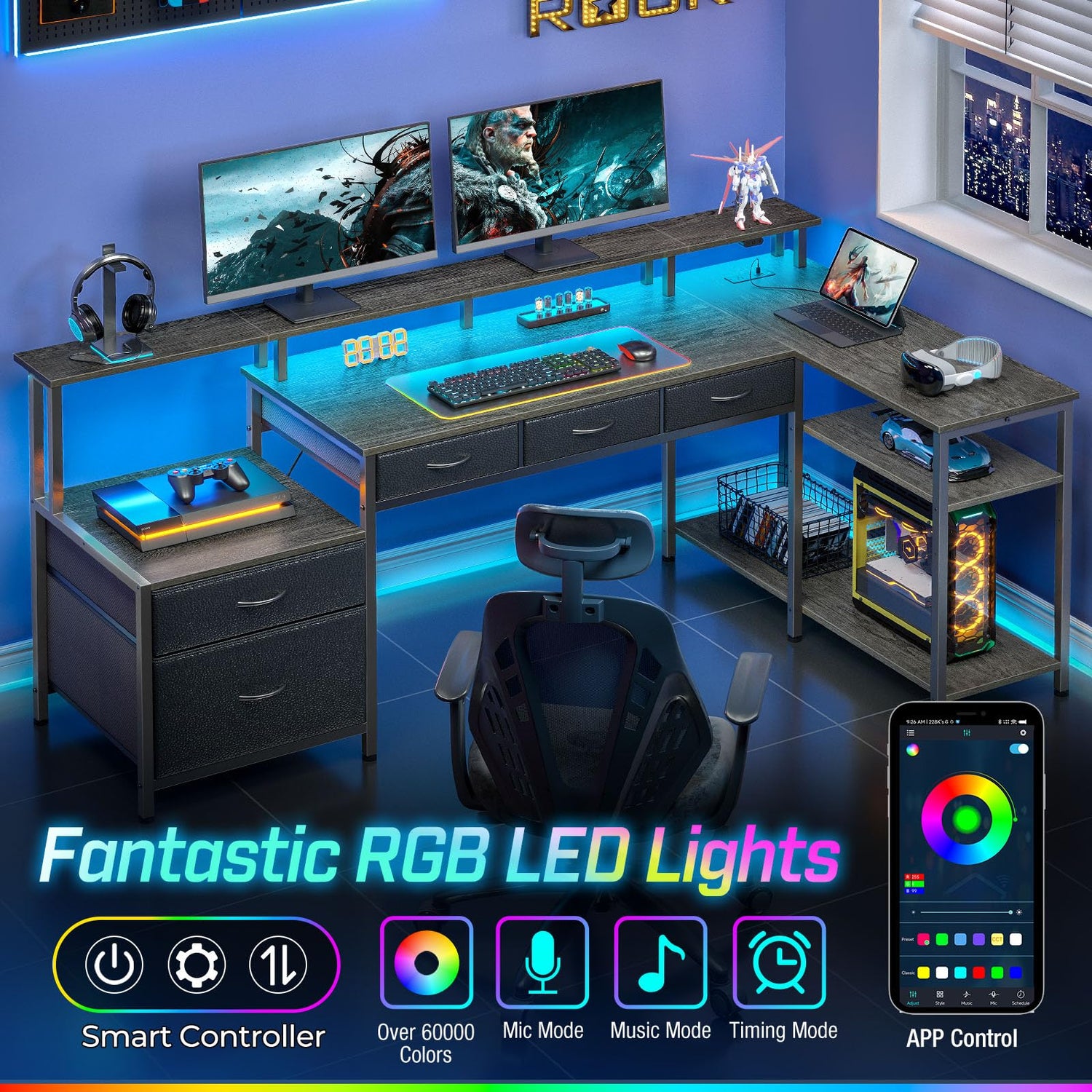 Seventable L Shaped Desk with File Drawers, 64" Home Office Desk with Power Outlet & LED Lights, Reversible Gaming Desk with Printer Storage Shelves, Corner Computer Desk with Monitor Stands, Grey