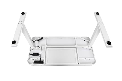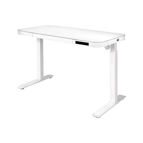 Work in style and ergonomic comfort with the airLIFT 47.5" Tempered Glass Electric Sit-Stand Desk. This standing desk combines tempered glass and steel for a sophisticated and modern piece of furniture inspired by mid-century design. It is topped with a wide (47.5" x 24") sheet of solid tempered glass backed in white. Designed for home or Office. The desk features an LED touch-sensitive control panel and two USB charging ports (1 USB-A, 1 USB-C Fast Charging). The height display disappears behind the LED face when the desk is not adjusting and shines through when active. Store up to 3 height settings on the touch-sensitive controller for consistent adjustment throughout the day. Moving from sit-to-stand during the day helps users stay active and reduce sedentary behavior while working, gaming or relaxing. Smoothly adjust from 27.5” to 46.5” with up to 176 lbs. evenly distributed across the tabletop. The frame is made of steel finished in white powered with a single quick and quiet electric motor. Screw-in leveling feet keep the desk stable while you sit and stand. Also, keep the kids safe with a built-in child-lock safety feature. Merely Press M and Down Arrow to Lock / Press M and Up Arrow to Unlock.